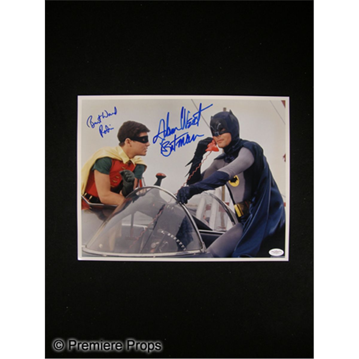 Oversized color photo from Batman (1966) signed by stars Adam West and Burt Ward in blue felt pen.