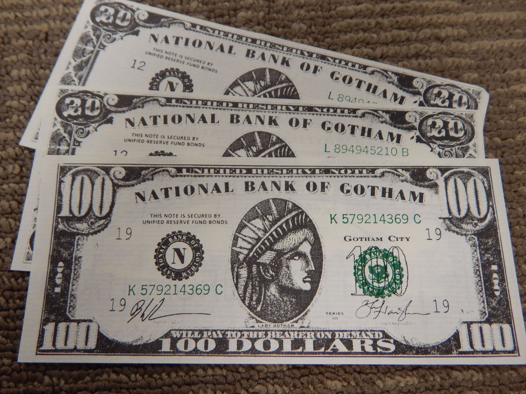 Set of three prop currency bills from the film Batman Returns. All items come with a certificate of authenticity good for the life of the piece.