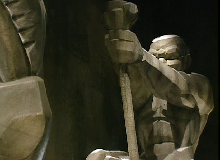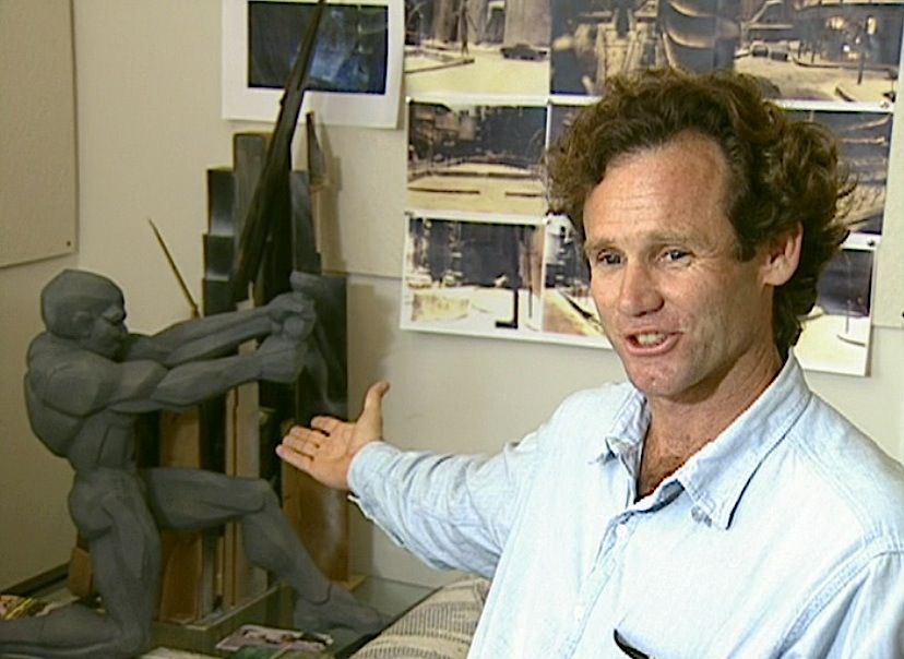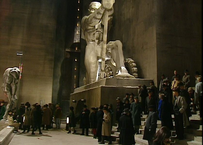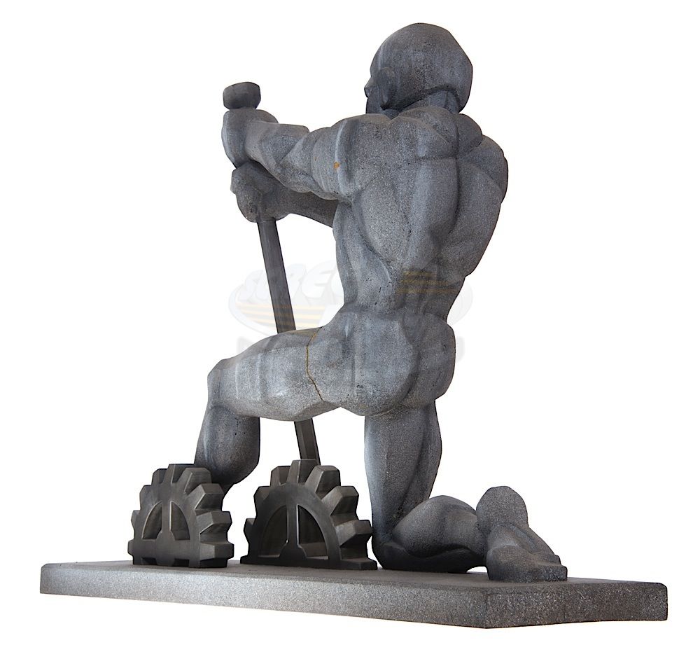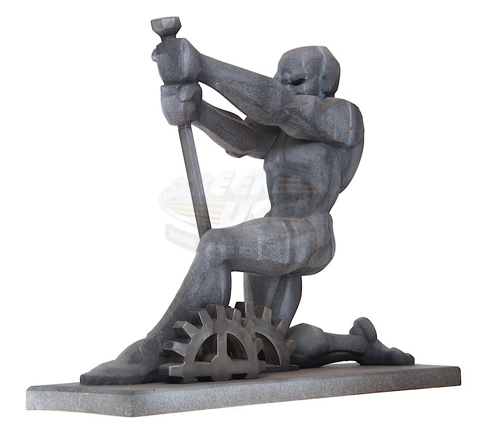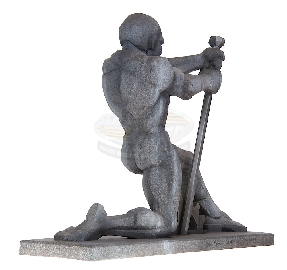 (Warner Bros. Pictures, 1992) This Gotham City monument maquette was custom-made by the production for use during pre-production. The monument is made of hard foam and plastic, mounted to a wood base and features a custom finish. The maquette stands an impressive 25" tall x 32" in length x 10" wide and features a man pulling the lever on large gears. This maquette can be seen in the special features section of the film's DVD. The man has a crack on his left leg, but does not effect the overall look of this incredible maquette.