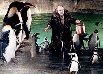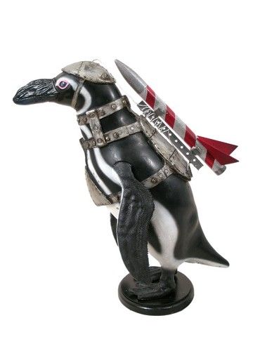 In 1992's “Batman Returns”, arch villain Oswald Cobbepot, aka The Penguin (Danny DeVito) battles Batman (Michael Keaton), and all of Gotham City by creating a flock of missile-carrying penguins that have special brain plates to control their minds so they can go all over the city like suicide bombers and create total destruction. However, at the last minutes, Batman is able to jam the frequency used to control the penguins and has them launch their missiles directly at the Penguin's base instead, collimating in the Penguin falling into the toxic waters to his death! These killer Penguin's became one of Burton's most inventive creations and a highlight in this delightful sequel. This is an actual screen used bombing Penguin, equipped with special straps to both hold its backpack launcher with attached deadly missile, and a special brain plate and cap and wiring to control their minds and tell them when and where their missiles are to be launched! The fully realized body of the penguin and the strapping's, launcher, and mind-control hardware are all made of industrial rubber, as are the flippers and feet, and then carefully painted and airbrushed for realism. The missile itself is made of wood. This grand prop is balanced and mounted on a custom wood stand for display. Comes with a COA. One of the most unique props from the entire "Batman" franchise! (Full size penguin is approx. 20"x6"x 7", missile is approx. 12", and the custom display stand is approx. 7"x6")