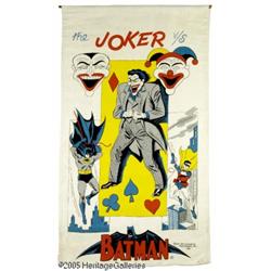 <B>Batman / Robin / Joker Canvas Banner (1966).</B></I> The Dynamic Duo flank their arch-foe the Joker on this nifty canvas banner, produced at the height of Batmania. Highly reminiscent of the work of Dick Sprang, this boasts fresh, bright colors and a crisp appearance, though some overall wrinkling and creasing is evident, as well as slight discoloration along the edges and some very small stains. The banner measures 16.5" x 29" and is in Very Good condition. A fabulous and rarely-seen collectible featuring the Clown Prince of Crime!