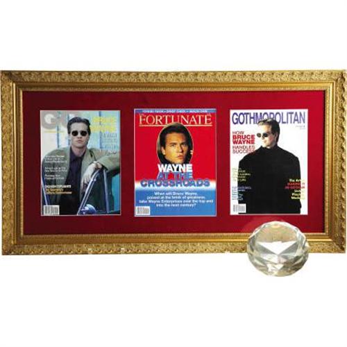 <B>"Batman & Robin" and "Batman Forever" Props. </B></I> An enormous cut-diamond prop stolen by actor Arnold Schwarzenegger as Mr. Freeze from the Gotham Museum's antiquity wing to power his evil freeze engine in <I>Batman & Robin</B></I> (1997). Also, prop newspaper covers for <I>GQ</B></I> (<I>Gotham Quarterly</B></I>), <I>Fortunate</B></I> and <I>Gothmopolitan</B></I> magazines, each featuring actor Val Kilmer as the affluent Bruce Wayne in <I>Batman Forever</B></I> (1995). All three covers are richly presented in common within a gold frame with red velvet matting. <I>Authenticated by the world's foremost curators of television artifacts, The Comisar Collection of Beverly Hills.</B></I><BR><BR><b>Shipping:</b> Clothing, Costumes & Jerseys (<a target="_blank" href="http://www.heritageauctions.com/common/shipping.php">view shipping information</a>)