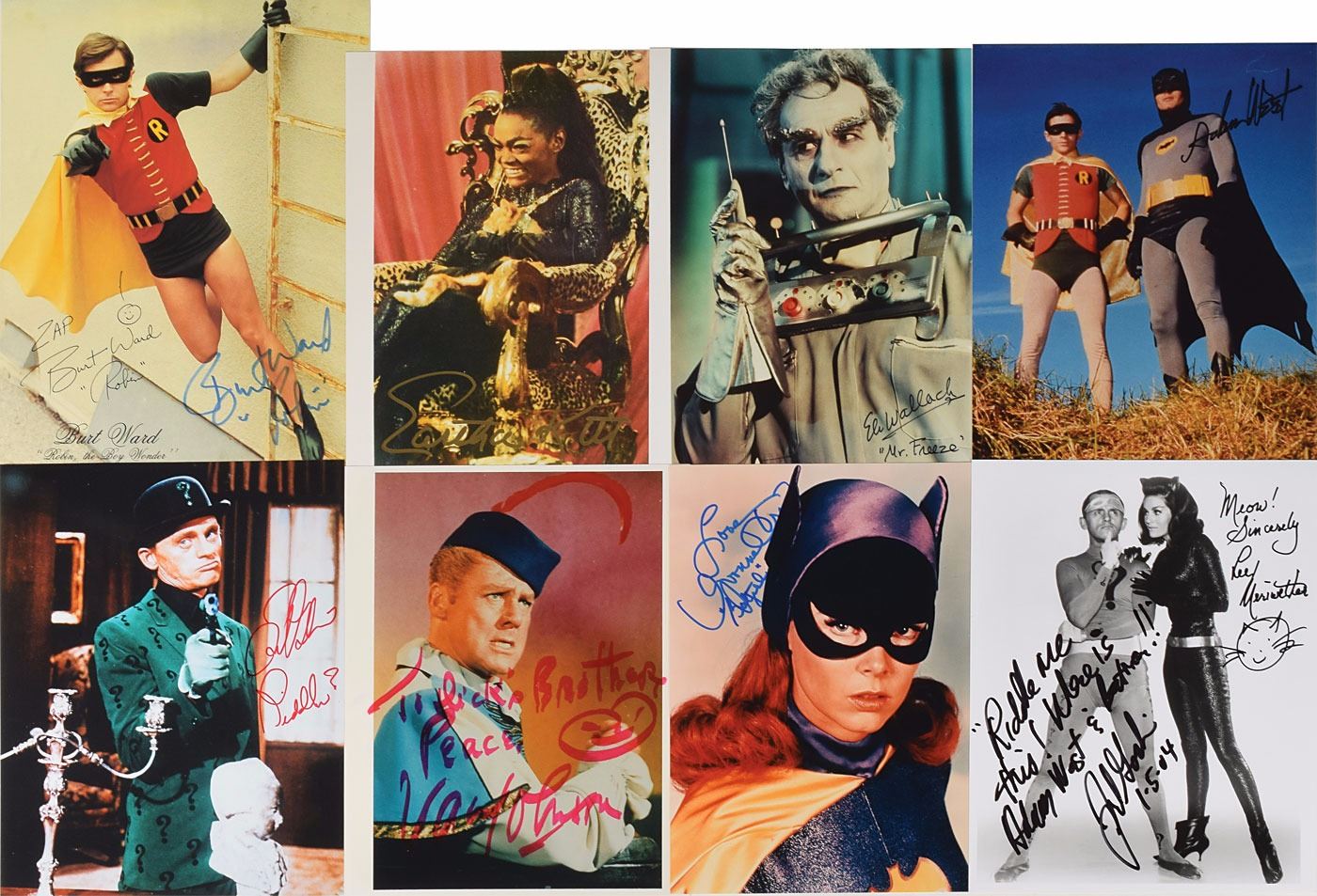 Collection of eight photos, ranging in size from 8 x 10 to 8.5 x 11, signed in various colored felt tip by one or more characters from the 1960s Batman television series, including: Adam West; Frank Gorshin; Van Johnson (ins); Yvonne Craig; Gorshin and Lee Meriwether; Burt Ward; Eli Wallach; and Eartha Kitt. In overall fine condition, with scattered creasing to the Ward.