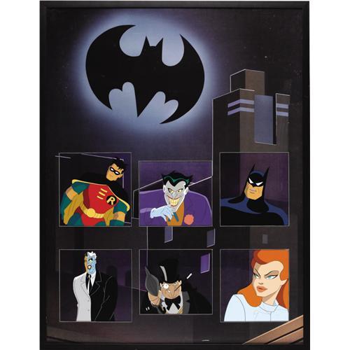 <B>"Batman: The Animated Series" Production Cel Original Art, Group of 6 (Warner Bros., 1992).</B></I> This incredible collection of hand-painted cels from "Batman: the Animated Series," feature Batman, Robin, Barbara Gordon, the Joker, the Penguin, and Two-Face. Each has an image area of 10" x 8", and is framed with a custom-made matte of the Gotham skyline, complete with a Bat-signal. The overall size is 34" x 44", and the condition is Excellent.<BR><BR><b>Shipping:</b> Framed (<a target="_blank" href="http://www.heritageauctions.com/common/shipping.php">view shipping information</a>)
