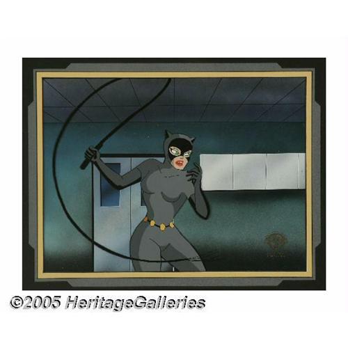 <B>""Batman: The Animated Series"" Catwoman Production Cel and Background (Warner Bros., 1992).</B></I> Selina Kyle uncovers a plot by industrialist Roland Daggett and his company scientist, Professor Milo, to infect animals with a disease that will spread through the city's strays and eventually affect the human populace as well. Daggett has the only cure which he plans to introduce onto the market. Catwoman pulls out the claws to stop them in this episode of ""Batman: The Animated Series"", titled ""Cat Scratch Fever"". This hand-painted production cel set-up consists of an original production cel featuring Catwoman, plus a photocopy of the original production background. With an image area of 11.5"" x 8.5"", the art is in Excellent condition. Includes a certificate of authenticity. <BR><BR><B>Important notice:</B> Heritage usually auctions material at the rate of 200-250 lots per hour. On some occasions eBay Live bid software or the Internet may not be able to keep up with the pace of the auction. We recommend placing a realistic absentee bid now as insurance to avoid disappointment. Occasionally the auctioneer may eliminate or reject an eBay Live bid, and the auctioneer may also reopen a lot after the close of the eBay live bidding (usually because we missed an audience bid), and may reject your bid even if it shows you as the winning bidder. By bidding via eBay Live, you agree that Heritage may award the lot to another bidder at its sole discretion under the circumstances described above or any other reasonable circumstances. Since eBay bids are not shown to us until we open the lot on the floor, we treat those bids just like floor bids. In most cases the floor responds before the eBay bid is presented to us, due to Internet lag time, so for consistency we have made it a policy that floor bids are always considered first over tie eBay live bids. Also please note that all Heritage lots purchased through eBay Live carry a 20% Buyer's Premium. Please make sure you