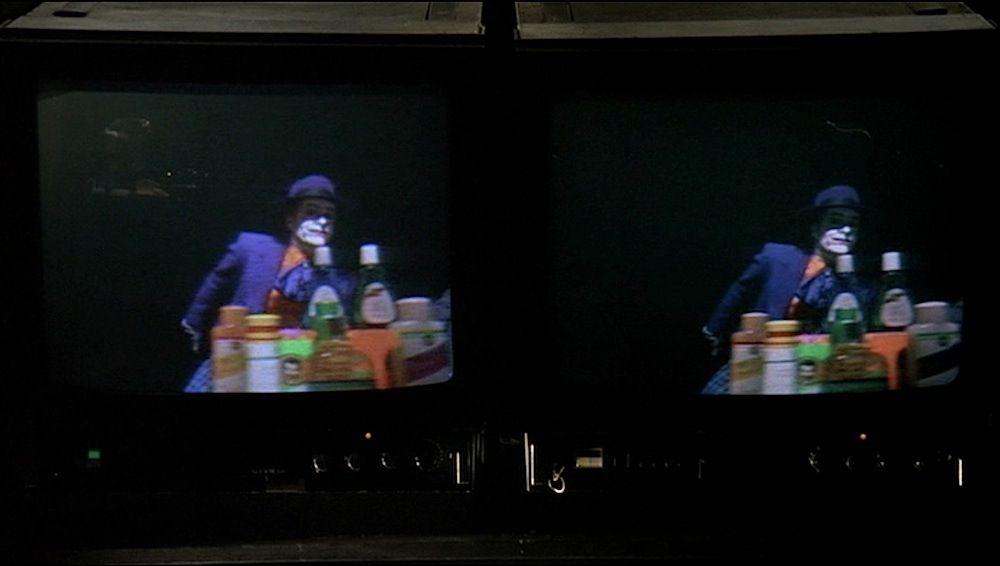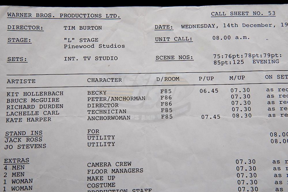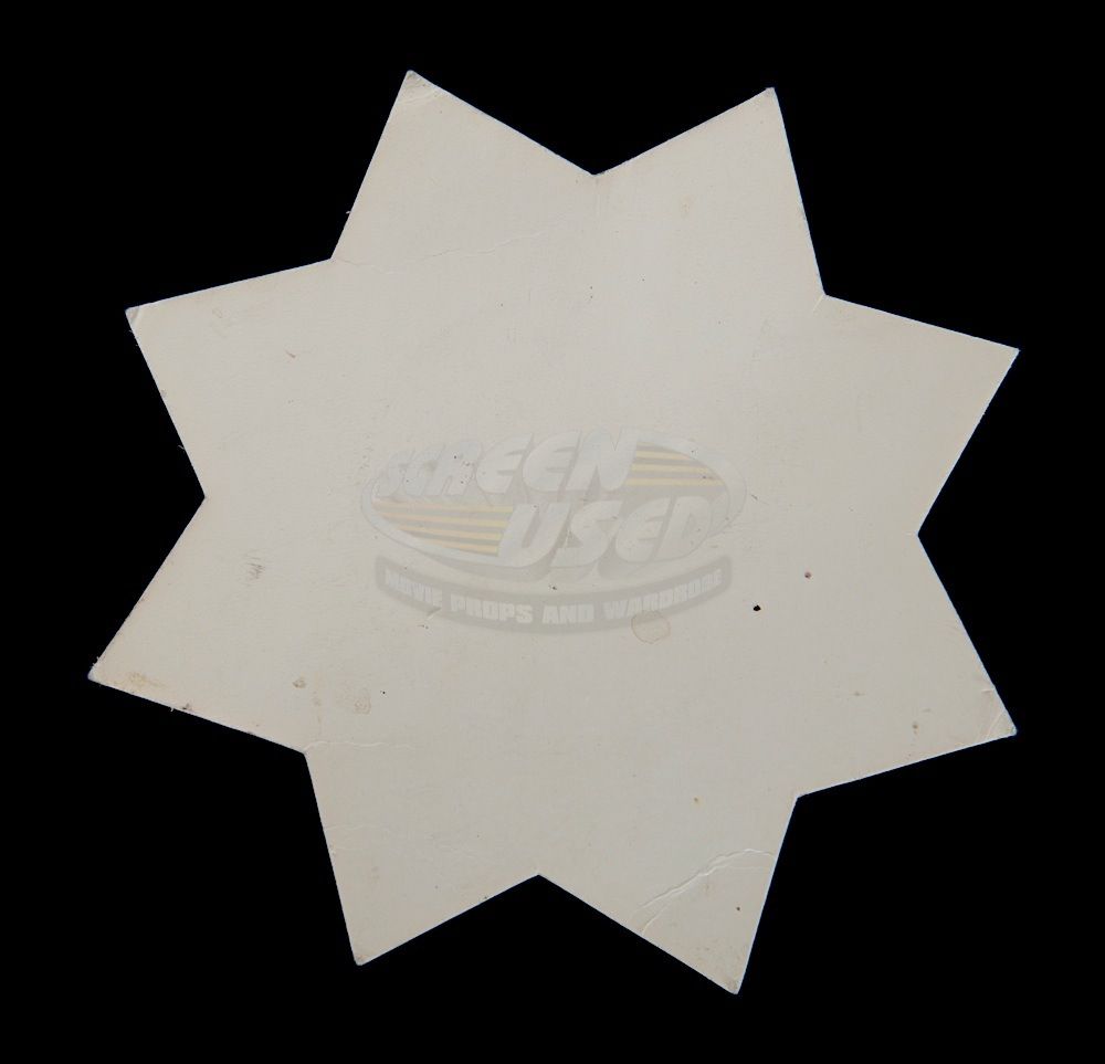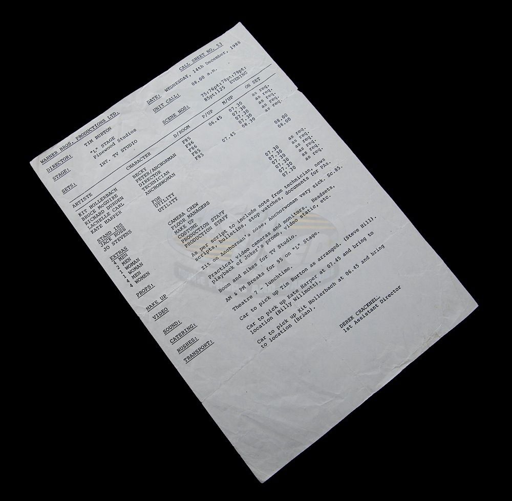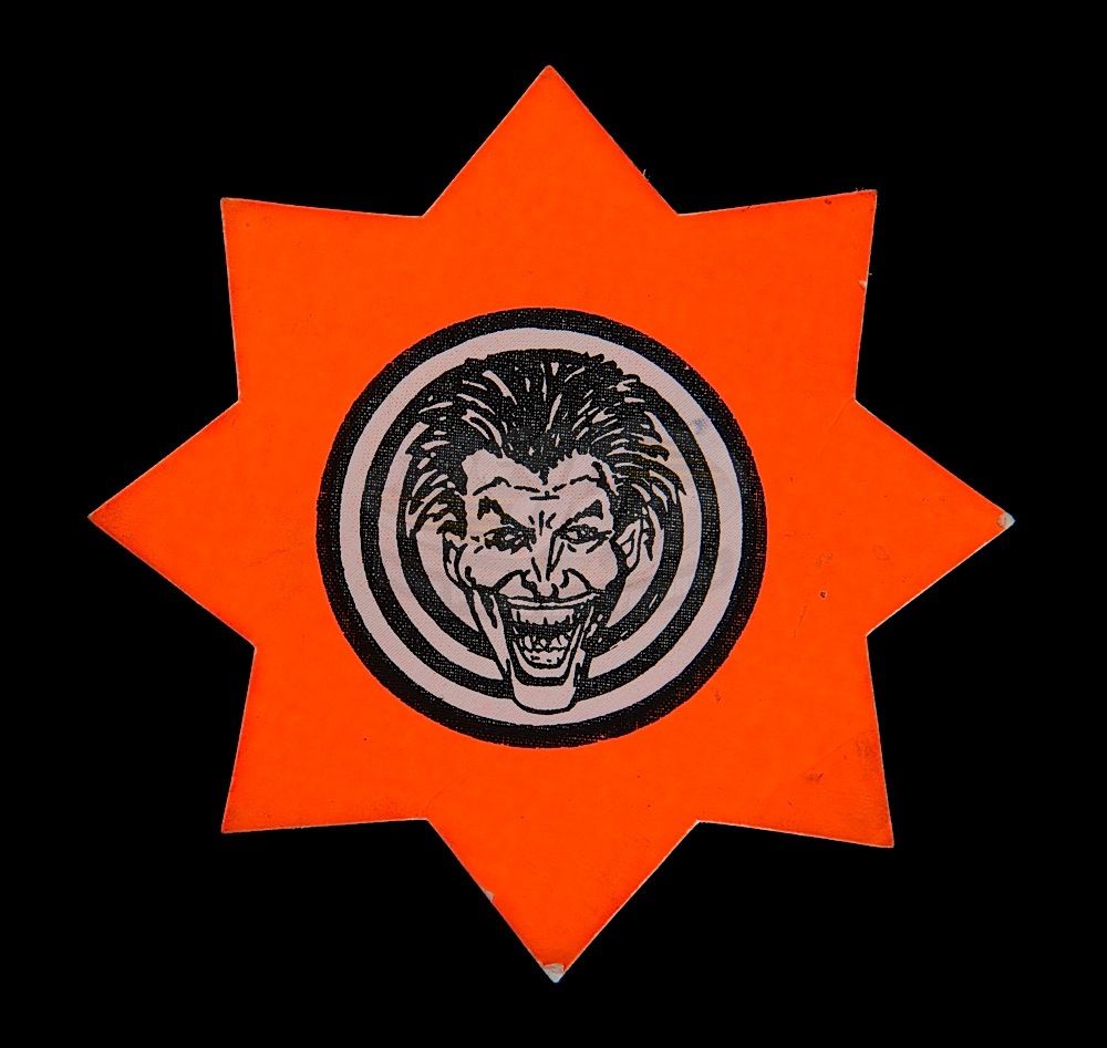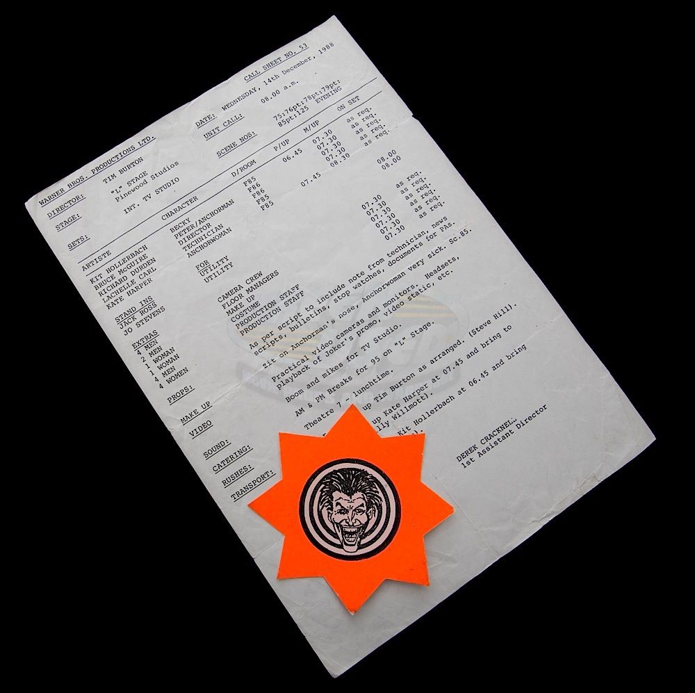 (Warner Bros., 1989) This Smylex badge was custom-made by the production for use as set dressing in the Joker's (Jack Nicholson) menacing infomercial, in which he introduces Gotham to his Smylex products. The badge measures 4" x 4" and features the image of the Joker on one side. Included with the badge is a one page single sided production call sheet that is dated 12/14/88 and details the requirements of the days shoot.