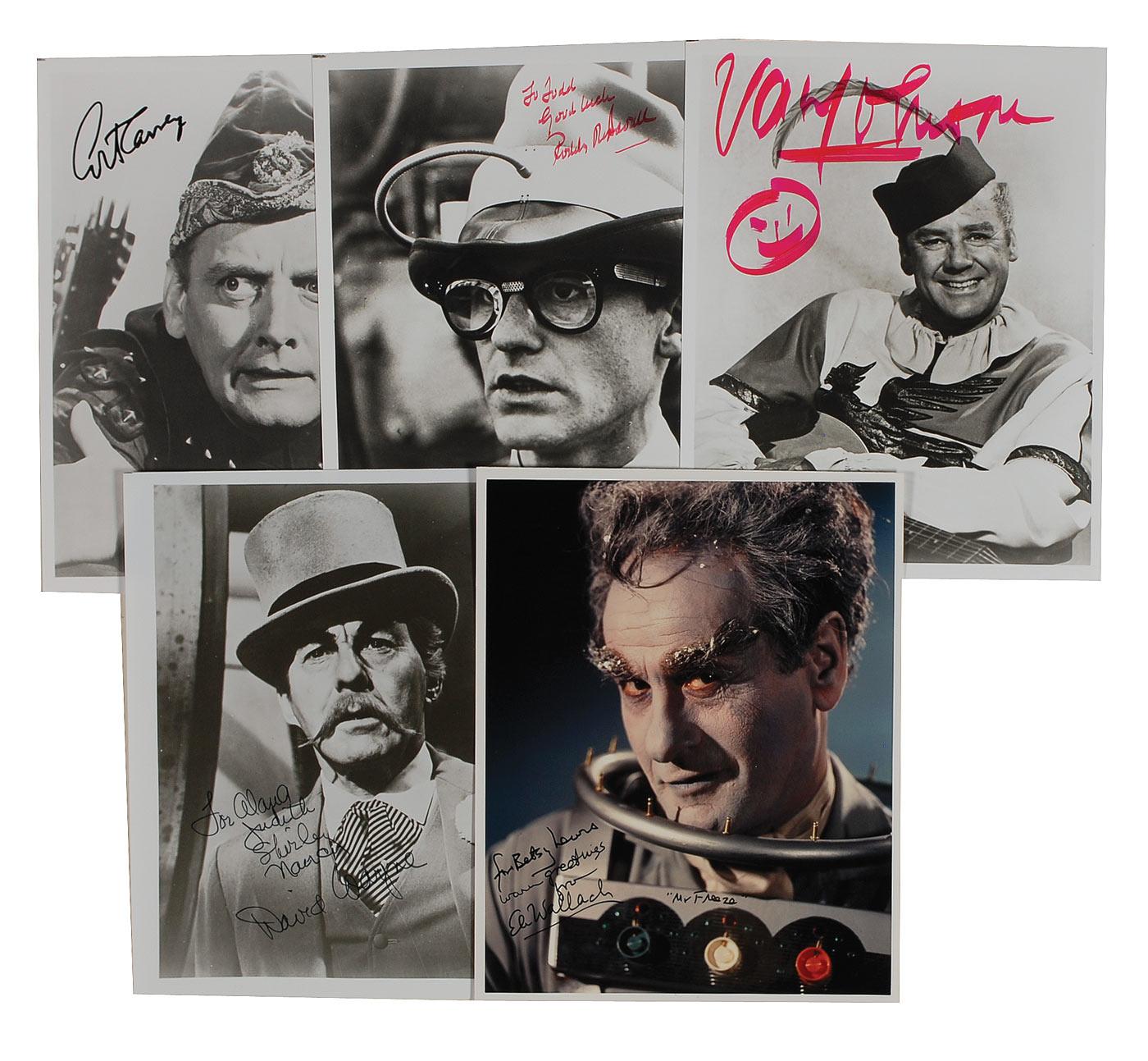 Five glossy 8 x 10 photos, one color, featuring some of Batman’s most beloved villains, each signed in ink or felt tip by the respective actors pictured. Signers are: Eli Wallach, Art Carney, Roddy McDowall, David Wayne, and Van Johnson. In fine condition, with light contrast to David Wayne’s signature.