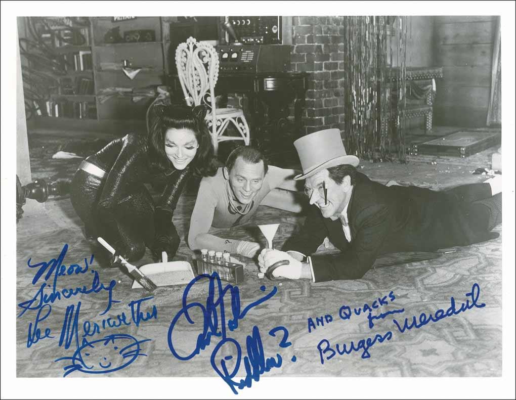 Glossy 10 x 8 photo of Catwoman, The Riddler, and The Penguin, signed in blue felt tip by Lee Meriwether, Frank Gorshin, and Burgess Meredith. In very fine condition.