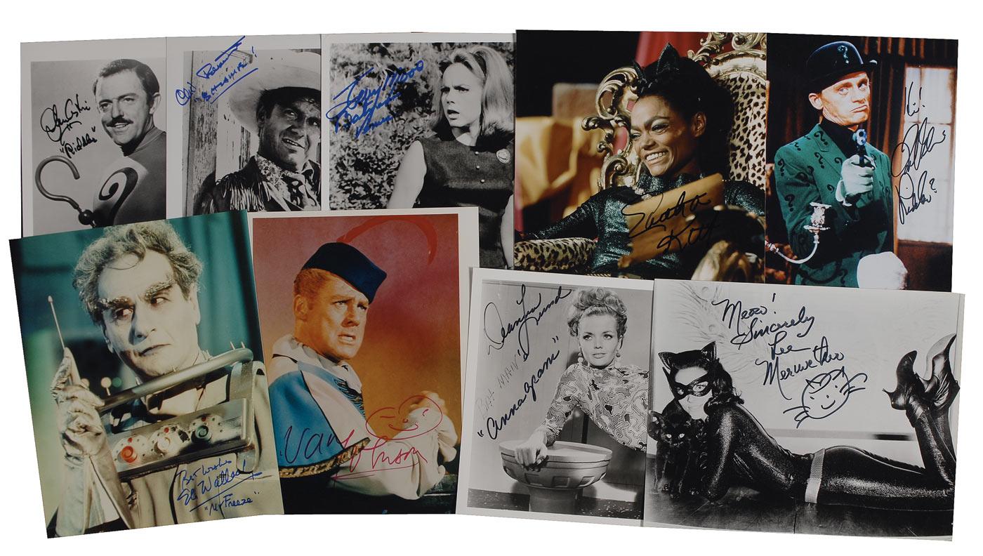 Nine different glossy 8 x 10 or 10 x 8 photos, four color, of Batman’s villains, each signed in felt tip by the respective actor pictured. Signers are: John Astin (adding “Riddler”), Frank Gorshin (satin finish, adding “Riddler”), Eartha Kitt (Catwoman), Van Johnson (Minstrel), Deanna Lund (adding “Annagram”), Lee Meriwether (adding “Meow!” and a sketch of a cat), Terry Moore (adding “Batman Venus”), Cliff Robertson (adding “Shame!”), and Eli Wallach (adding “Mr. Freeze”). In overall fine condition.