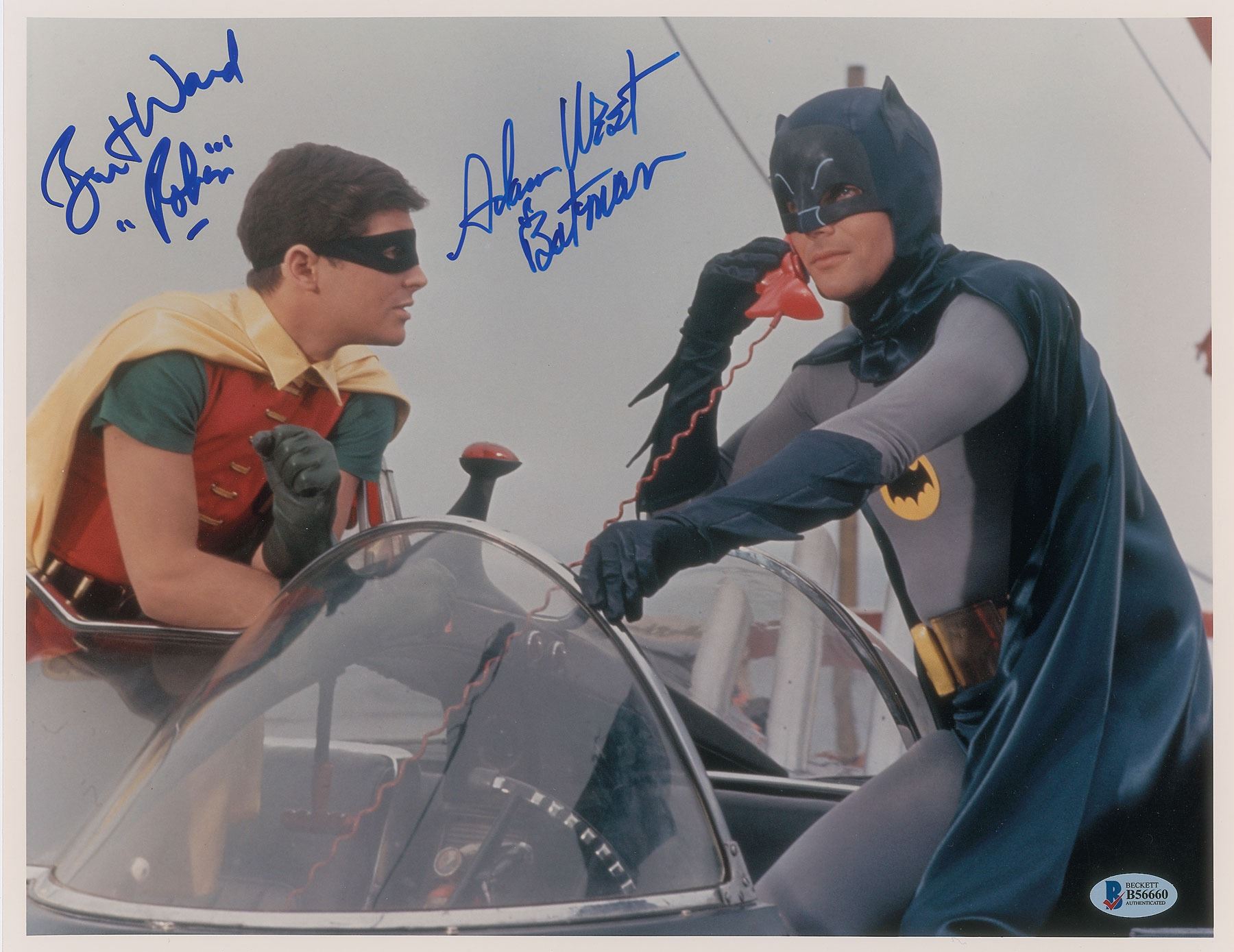 Color satin-finish 14 x 11 photo of Batman speaking on the Batmobile's phone as Robin looks on, signed in blue felt tip, "Adam West, Batman" and "Burt Ward, 'Robin.'" In very fine condition, with a Beckett authenticity label affixed to lower right corner. Accompanied by a certificate of authenticity from Beckett Authentication Services.