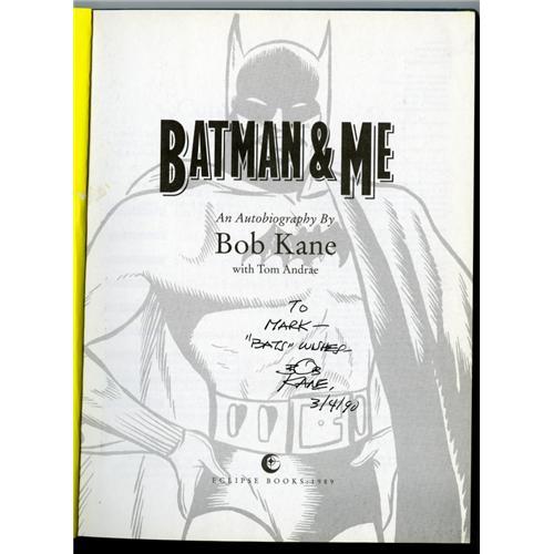 <B>"Batman and Me" Signed by Bob Kane (Eclipse, 1989).</B></I> An autobiography of the late Bob Kane that is also a biography of his greatest creation, the Batman. Lavishly illustrated in black and white and color, this first edition copy is inscribed "To Mark - 'Bats' Wishes - Bob Kane, 3/4/90" on the title page. In Excellent condition with very minor wear to the front cover and top edge of the spine. <BR><BR><B>Important notice:</B> Heritage usually auctions material at the rate of 200-250 lots per hour. On some occasions eBay Live bid software or the Internet may not be able to keep up with the pace of the auction. We recommend placing a realistic absentee bid now as insurance to avoid disappointment. Occasionally the auctioneer may eliminate or reject an eBay Live bid, and the auctioneer may also reopen a lot after the close of the eBay live bidding (usually because we missed an audience bid), and may reject your bid even if it shows you as the winning bidder. By bidding via eBay Live, you agree that Heritage may award the lot to another bidder at its sole discretion under the circumstances described above or any other reasonable circumstances. Since eBay bids are not shown to us until we open the lot on the floor, we treat those bids just like floor bids. In most cases the floor responds before the eBay bid is presented to us, due to Internet lag time, so for consistency we have made it a policy that floor bids are always considered first over tie eBay live bids. Also please note that all Heritage lots purchased through eBay Live carry a 22.5% Buyer's Premium. Please make sure you read the Terms and Conditions before you bid. This lot is being auctioned in conjunction with a live floor auction by Heritage Auction Galleries. All final auction and invoice information will be supplied by Heritage Auction Galleries, and all other information should be considered preliminary. Lot:41001 <BR><BR><B>Winning Notification and Billing:</B> After the FINAL session in this auction is complete, Heritage will send e-mail and snail mail invoices. This process normally takes several days. All final auction and invoice information will be supplied by Heritage Auction Galleries, and all other information should be considered preliminary. <BR><BR>This auction will be conducted on a live auction floor and over the Internet through eBay Live. If you choose to place an absentee bid, please take a moment to <font color='#0000ff'><u><a href='http://pages.ebay.com/liveauctions/help/before/laabsentee.html'>learn how eBay Live absentee bidding works</a></u></font><font color='#000000'>