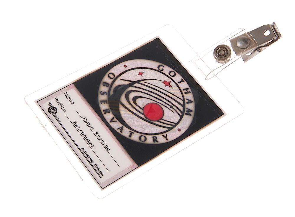 (Warner Bros. Pictures, 1997) This ID badge was custom-made by the production for use by various actors. The laminated badge features the "Gotham Observatory" logo on one side with attached metal clothing clip. Measures 5" x 2.5".