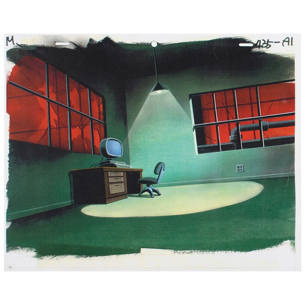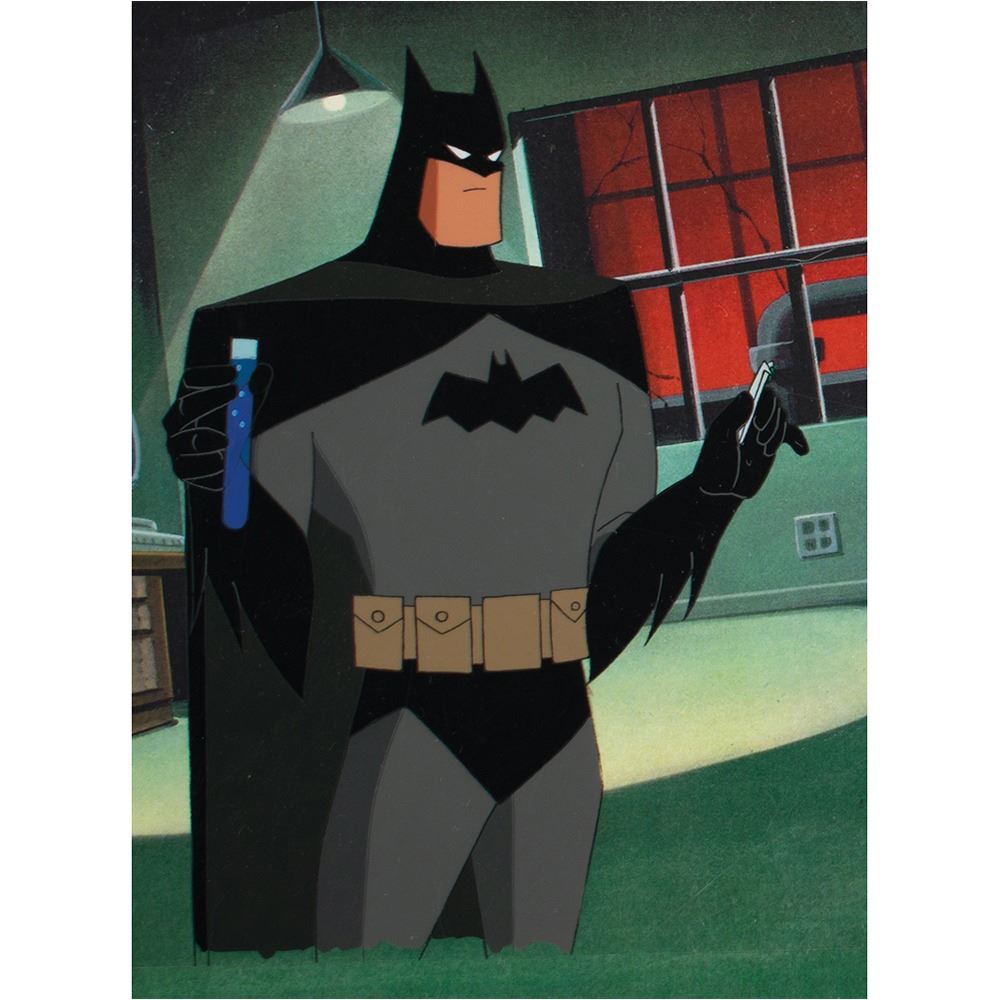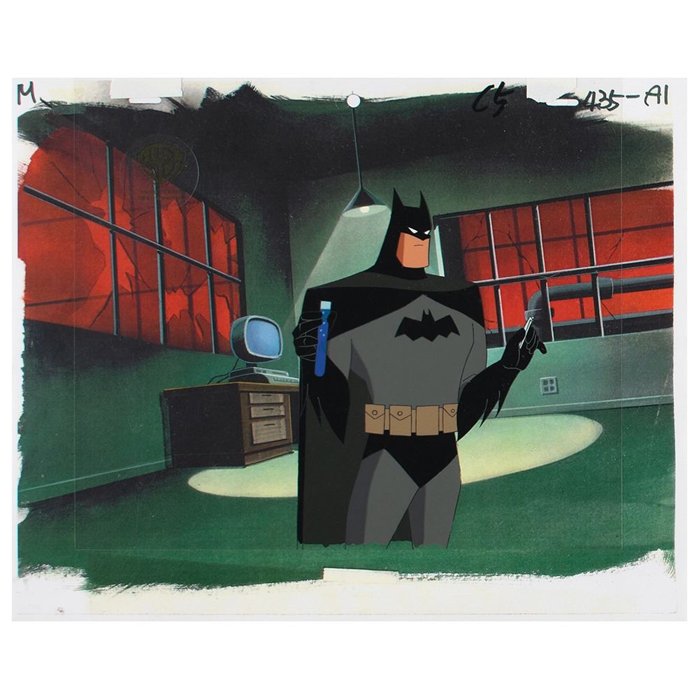 (Warner Brothers Studios, 1997) Original production cel of Batman from The New Batman Adventures, which shows the caped crusader conducting a lab experiment in a great half-length pose. The cel is placed on a matching laser background. Image measures 4.75 x 7, with overall dimensions of 13 x 10.5. The piece has the Warner Bros. Production Art seal to upper left. In fine condition, with a couple trivial dings. Accompanied by a certificate of authenticity from Warner Bros.