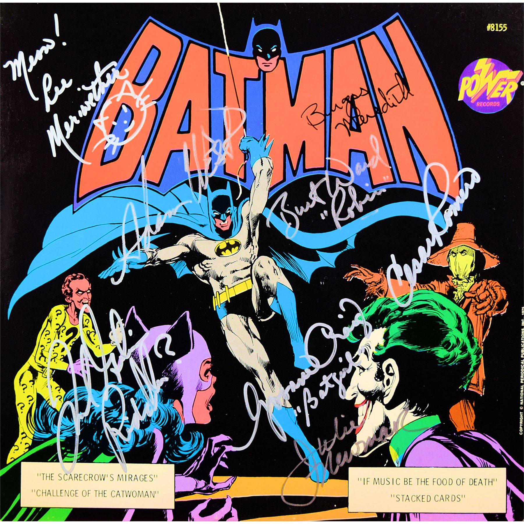 1975 Batman soundtrack includes the Songs: The ScarecrowÕs Mirages, Challenge Of The Catwoman, If Music Be The Food Of Death & Stacked Cards. Signed: Adam West, Burt Ward Robin, Frank Gorshin Riddler?, Yvonne Craig Batgirl, Cesar Romero, Burgess Meredith, Julie Newmar & Meow! Lee Meriwether