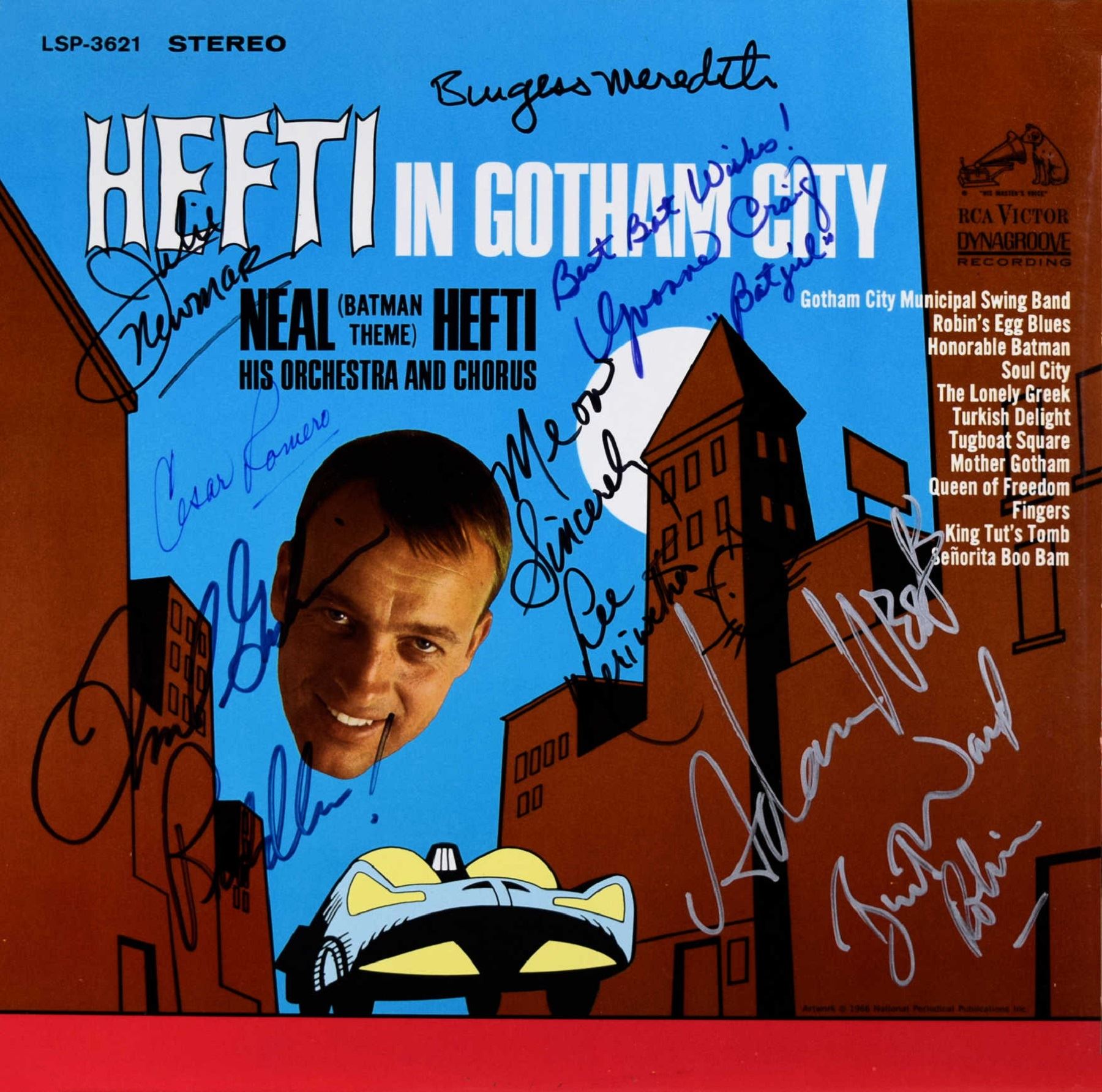 1966 Batman Hefti In Gotham City soundtrack album. Signed: Adam West, Burt Ward Robin, Frank Gorshin Riddler!, Best Bat Wishes! Yvonne Craig Batgirl, Cesar Romero, Burgess Meredith, Julie Newmar & Meow Sincerely Lee Meriwether with Cat Drawing.