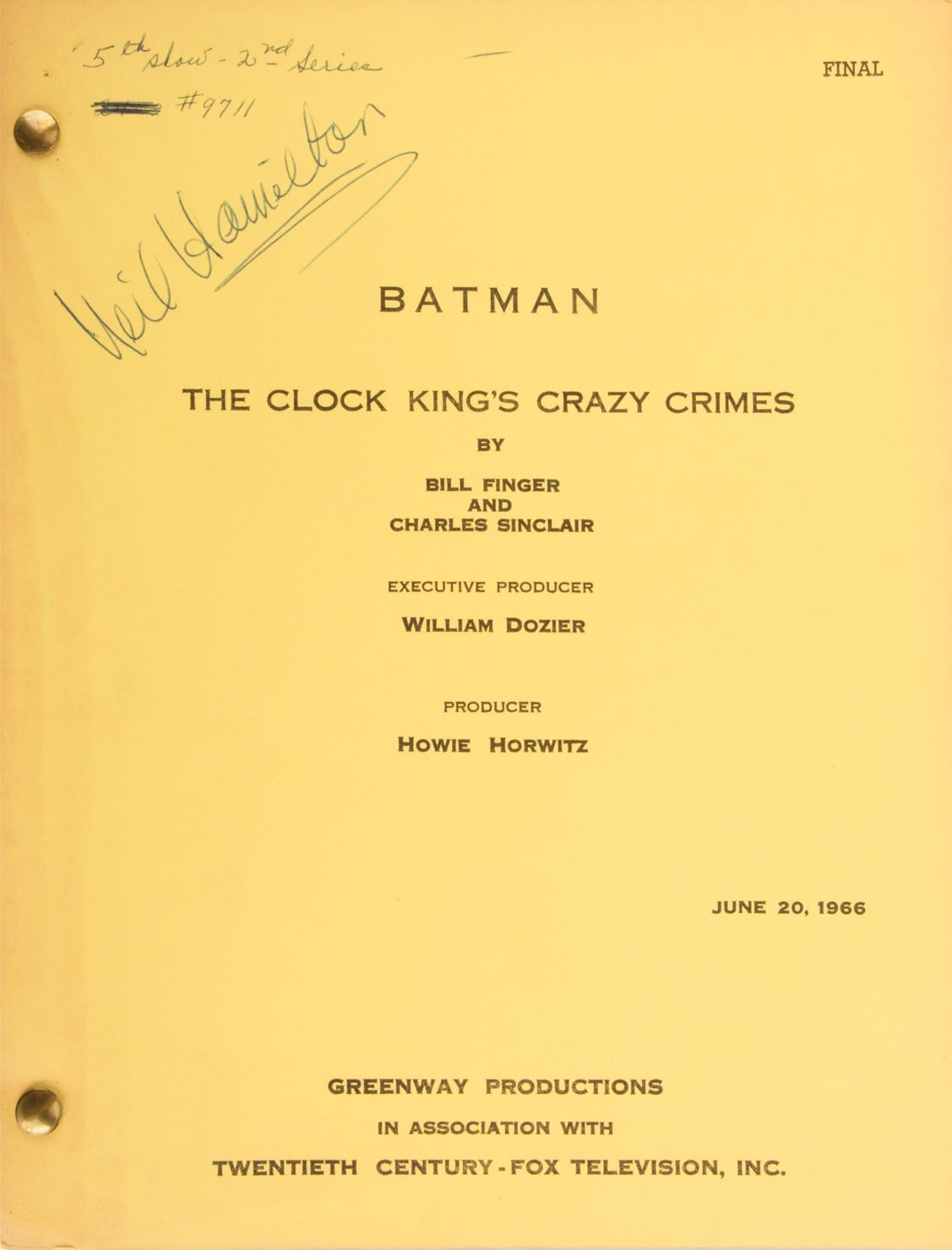 96. Batman television series (10) first-half of season-two shooting scripts. (TCF, 1966) Vintage (10) original various drafts shooting scripts in studio-printed yellow wraps, dated from May 9 through September 20, 1966 for second season episodes of the 1960s camp classic television series, Batman. Titles include "Shoot a Crooked Arrow", "Hot Off the Griddle", "The Minstrel's Shakedown", "The Spell of Tut" [(2) different drafts], "The Greatest Mother of Them All", "The Clock King's Crazy Crimes", "An Egg Grows in Gotham", "Green Ice" and "The Impractical Joker". (4) scripts ex-libris Neil Hamilton "Commissioner Gordon", and are signed on front covers by him, as well as (2) containing additional elements (call sheets, etc.) plus (3) of these contain extensive internal hand-notations and corrections. Composed variously of white first draft, and blue, orange, pink and green correction pages. All presumed complete. Interiors generally remain fresh and unhandled with a few exceptions; wraps exhibit occasional dampstaining, notations, foxing and other minor defects, overall good to very good condition. $1,200 - $1,500