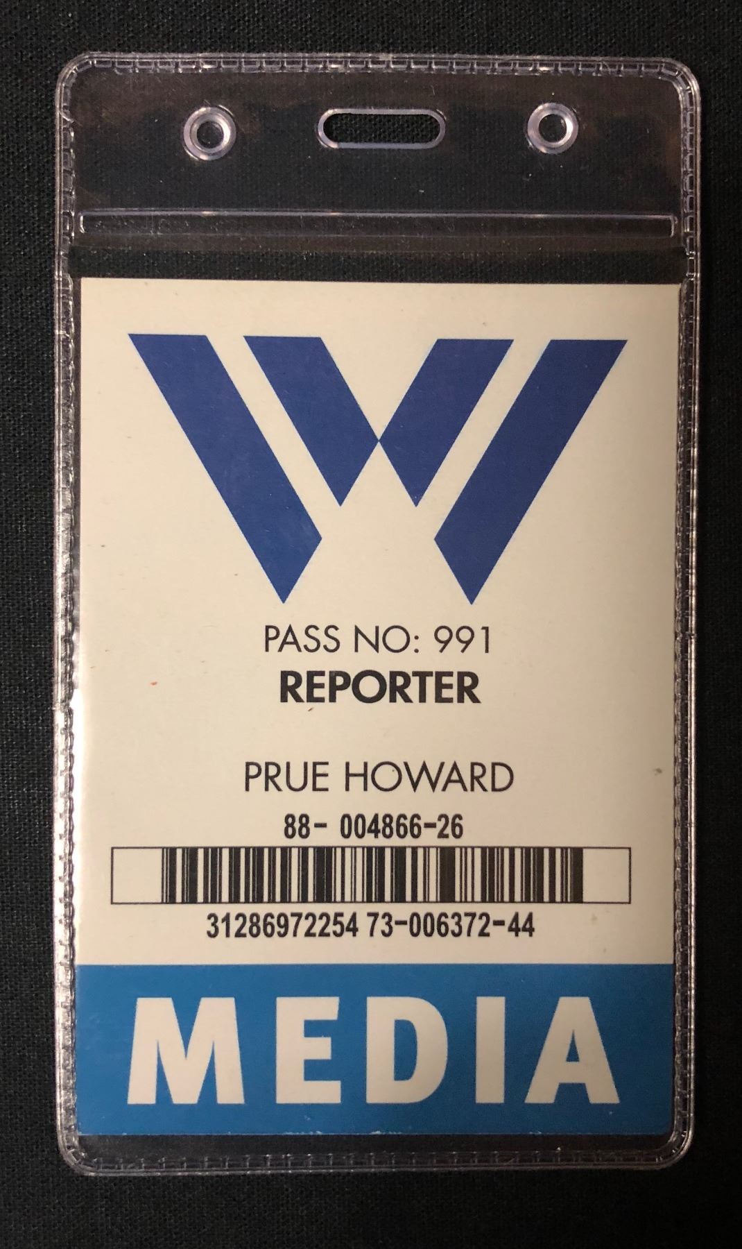 Screen used media badge used by reporter "Prue Howard" in the production of the Zack Snyder directed superhero film "Batman v Superman: Dawn of Justice" (2016), where fearing that the actions of Superman are left unchecked, Batman takes on the Man of Steel, while the world wrestles with what kind of a hero it really needs, featuring an ensemble cast that includes Ben Affleck, Henry Cavill, Amy Adams, Jesse Eisenberg, Diane Lane, Laurence Fishburne, Jeremy Irons, Holly Hunter, and Gal Gadot.