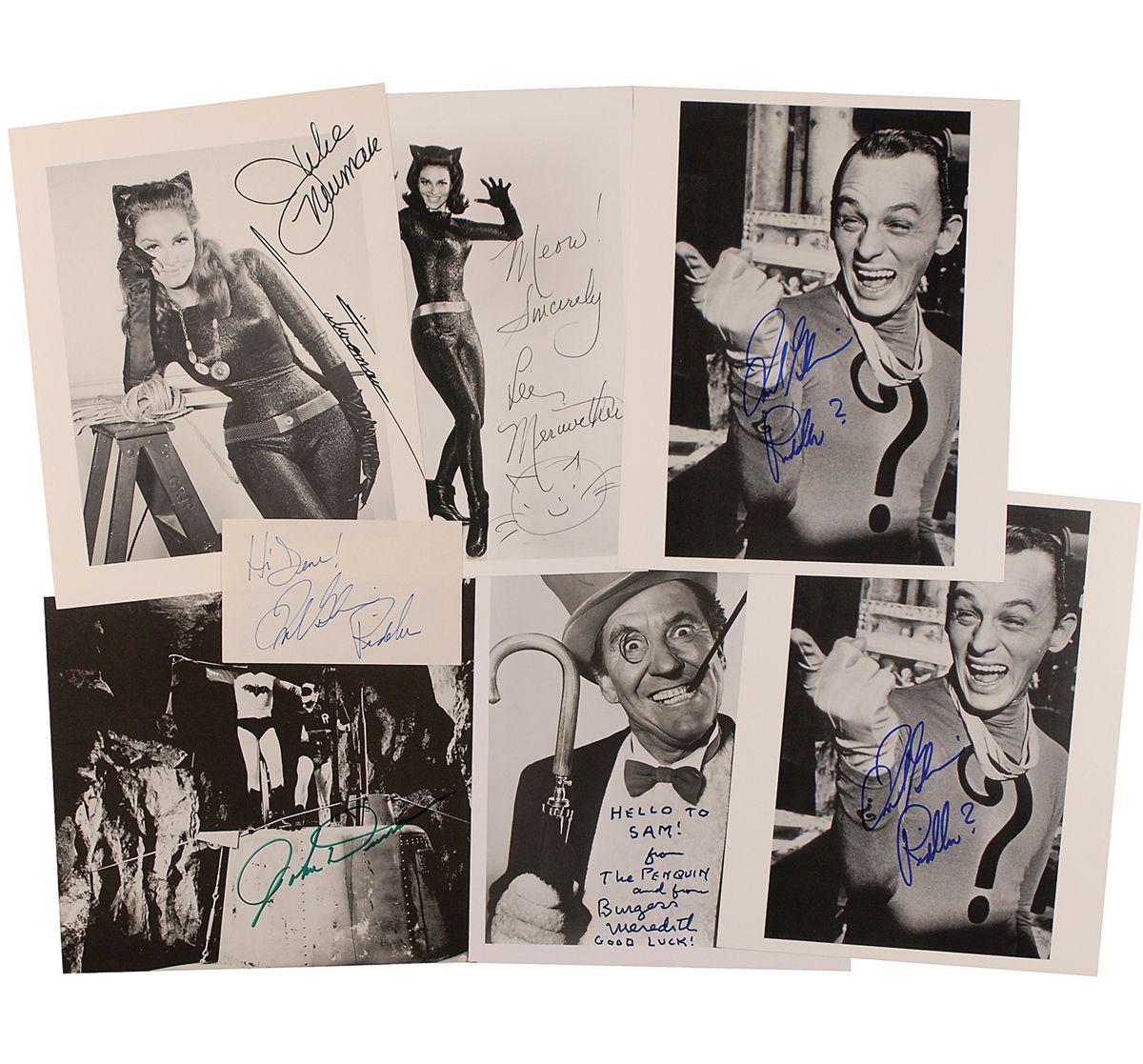 Seven items: Frank Gorshin signature on a 5 x 3 card and six glossy 8 x 10 photos of Batman characters, each signed by the respective actor or actress. Signers are: Lee Meriwether, Julie Newmar, Burgess Meredith, Frank Gorshin (2), and John Duncan. Most have added their character’s name below their signature. In fine condition.