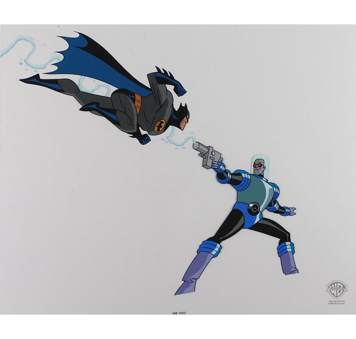 Limited edition Warner Bros. color model cel of Batman battling a villain on a 16.5 x 13.5 acetate sheet. Cel bears a silver Warner Bros. stamp to the lower right. In fine condition.