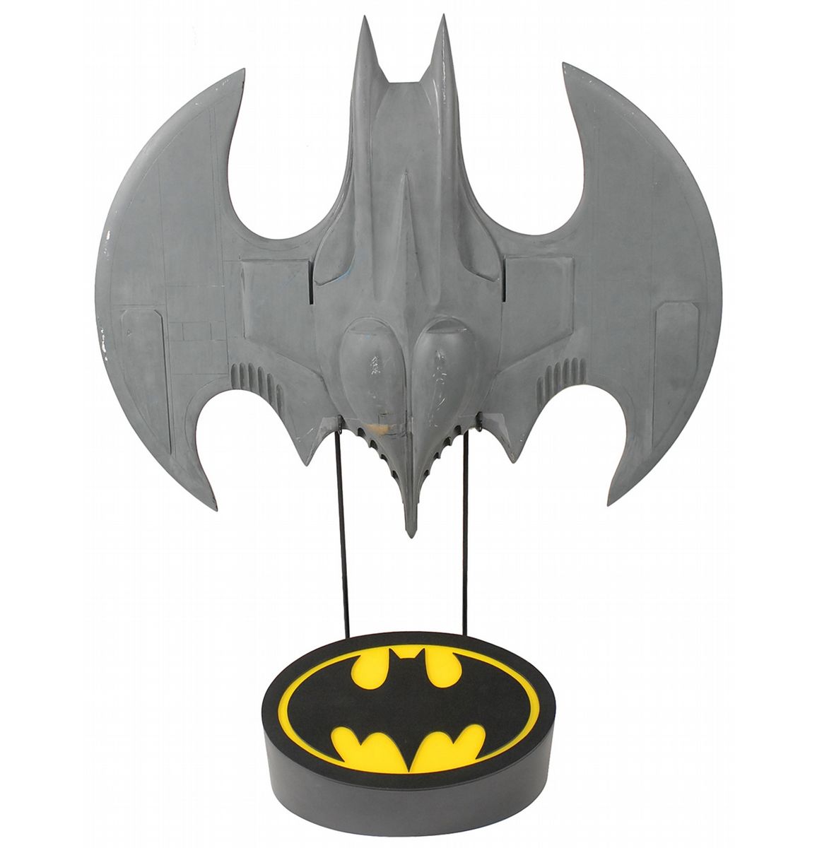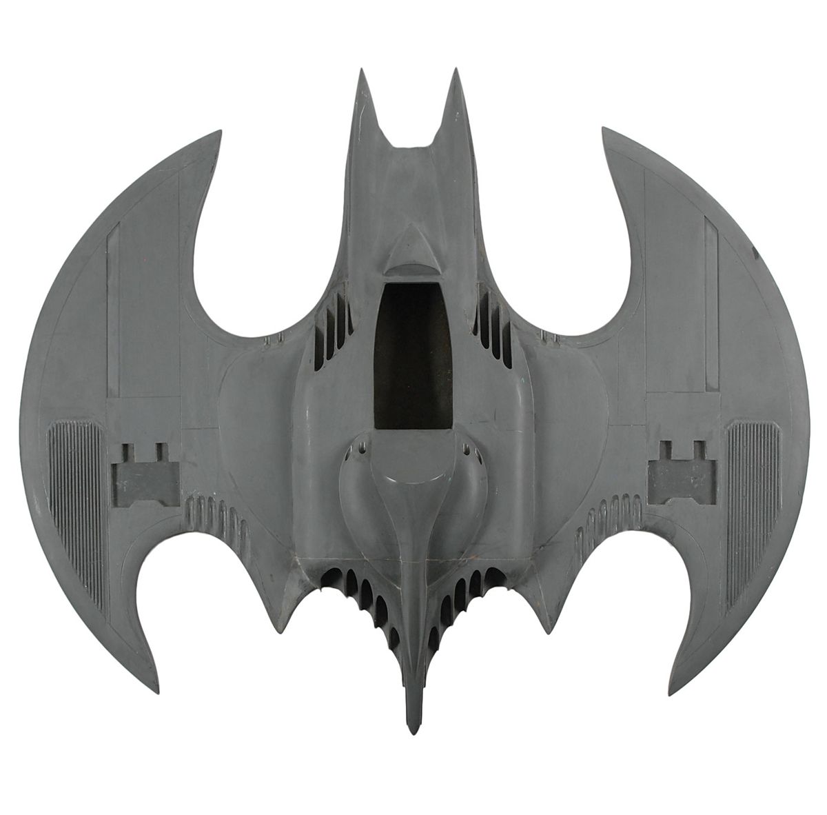 Very nice production-used Batwing miniature used in the 1989 film Batman. Detailed hollow fiberglass model measures 27? wide and 24? long. Entire model has been hand-painted with gray paint. There were three different sized models created for different depth and purposes: a 1/4 scale (about 10 feet long), a 1/12 scale (about 2 feet long), and 1/48 scale (about 6 inches long). In fine condition, with no canopy. Also includes a custom-made stand showing the instantly recognizable Batman logo. This is one of the miniature production Batwings that would have been used in the flying sequences.
