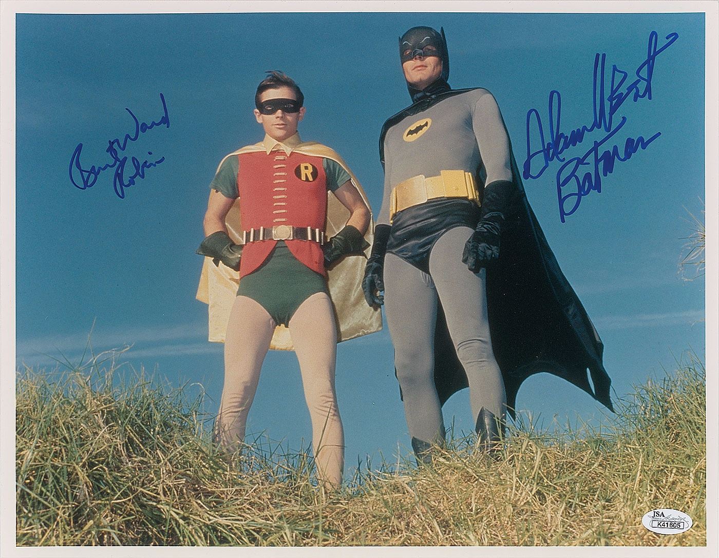 Color semi-glossy 14 x 11 full-length photo of the two caped crusaders, signed in blue felt tip, "Adam West, Batman" and "Burt Ward, Robin." In fine condition. Accompanied by a certificate of authenticity from JSA.