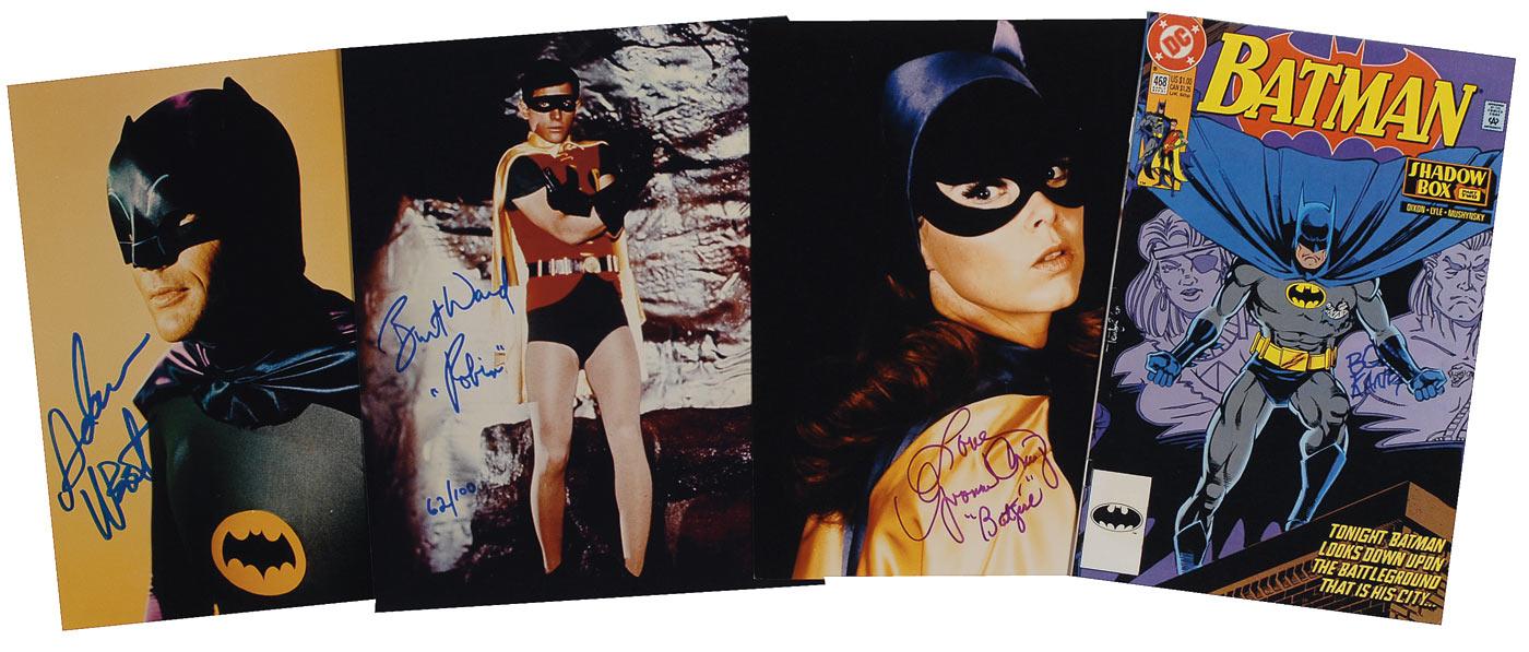 Four items: three color glossy 8 x 10 photos of Batman, Robin, and Batgirl, respectively signed in blue felt tip by Adam West and Burt Ward (adding “Robin” and limited edition #62/100), and purple felt tip by Yvonne Craig, adding her character name; and a DC Comics Batman comic book, #468, dated September 1991, signed on the cover in blue felt tip by Bob Kane. In overall fine condition.