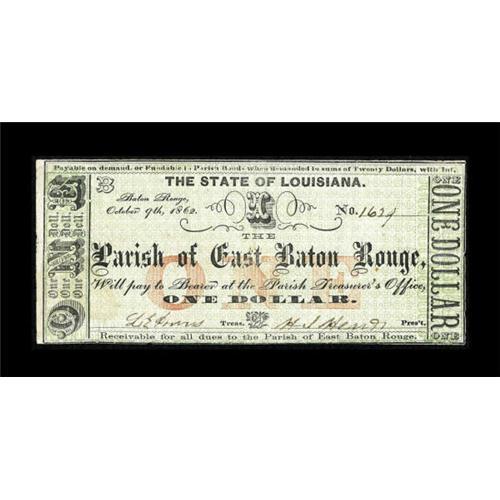 <B>Baton Rouge, LA- Parish of East Baton Rouge</B></I> $1 Oct. 9, 1862<BR> A nice example of this green tinted note. <B>Very Fine.</B></I><BR><I>From The Collection of a Louisiana Gentleman.</B></I><BR><BR><b>Shipping:</b> Coins & Currency (<a target="_blank" href="http://www.heritageauctions.com/common/shipping.php">view shipping information</a>)