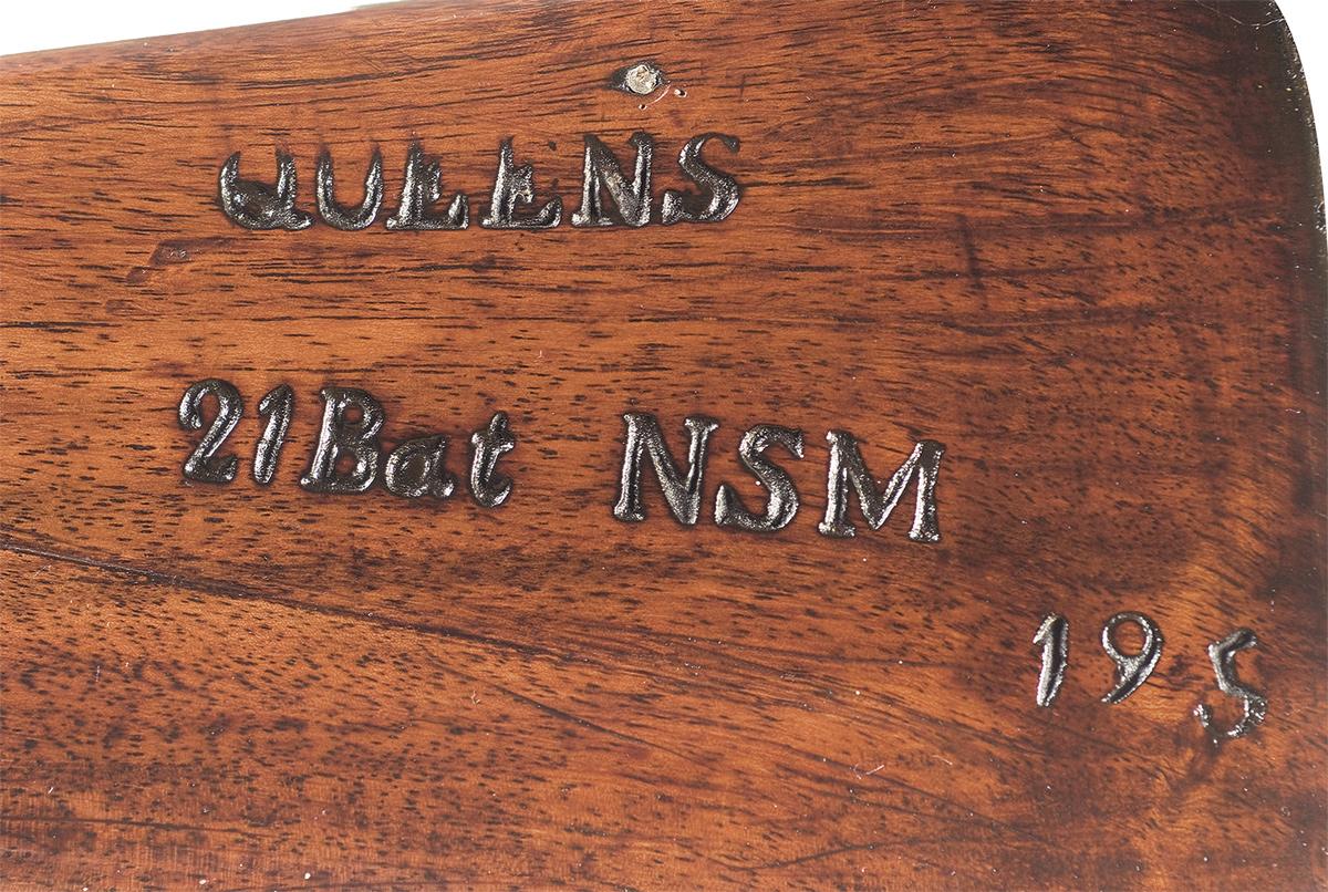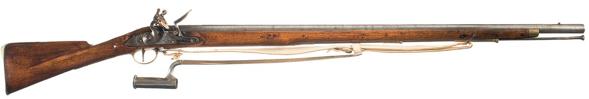 Bayonet lug front sight and shallow groove rear sight, with a "crown/ GP/ arrow" and a crossed scepter proof on the upper left side of the chamber. Lock plate is lightly marked "1805" over a stamped "TOWER" at the rear and large crown/GR with a crown/arrow proof in front, along with "1805". The right side of the barrel and buttplate tang are later marked "1805". Smooth straight grip stock with brass forend tip, ramrod pipes, trigger guard, side plate and buttplate. The left side of the buttstock is marked "QUEENS / 21 Bat NSM / 195", with the number "4" and the letters "TF" on the left stock flat. Complete with white leather sling, button tipped iron ramrod and a socket bayonet. The bayonet has a 17 inch blade marked "I. SLATER" and a crown/29 proof.