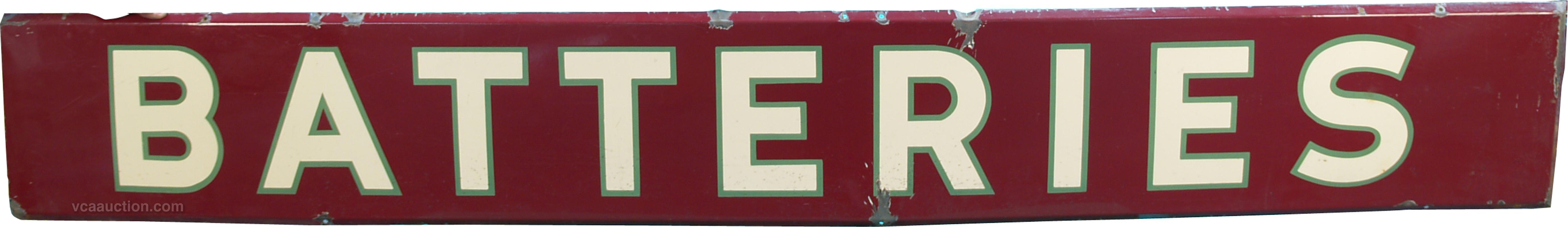 "Batteries" Chevron Service Station Porcelain Sign, Maroon w/ Beige & Green Letters - 104" x 14"
