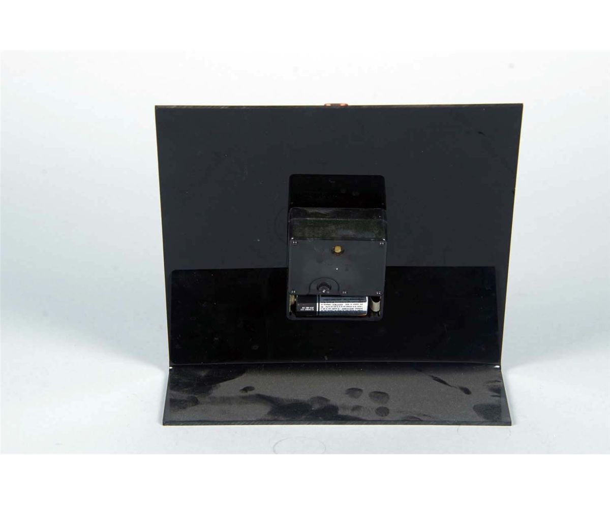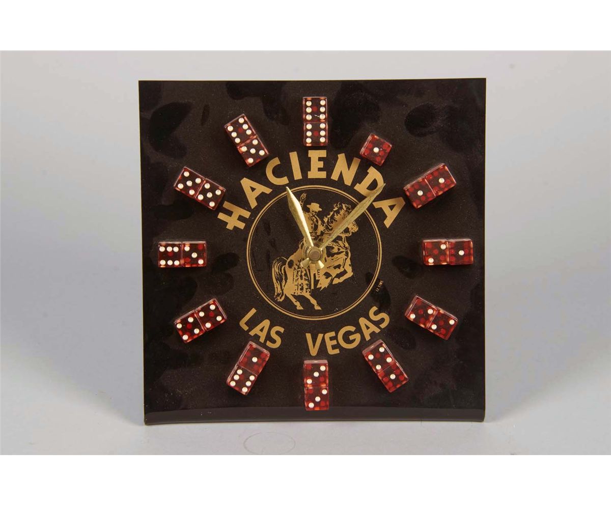 Black plexiglass standup with red dice for hour markings and gold cowboy graphic at center. Works great. Condition (Very good). Size 9" x 9"