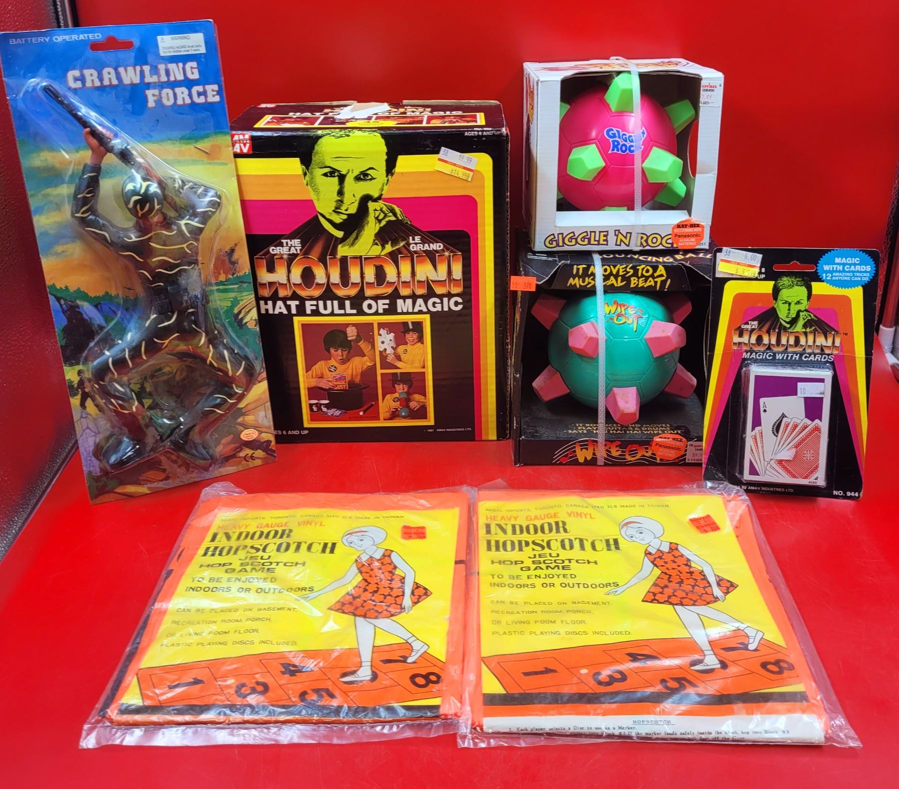 Battery Operated Army Crawler, Houdini Magic Kit, 2 Balls, & Indoor Hopscotch