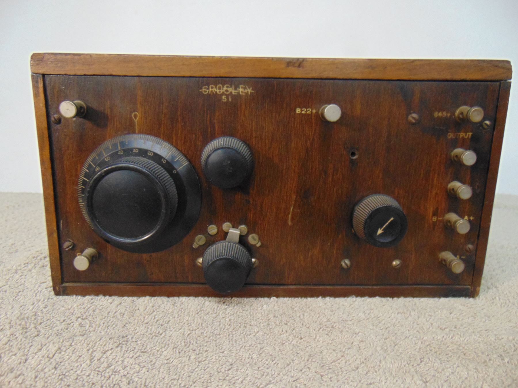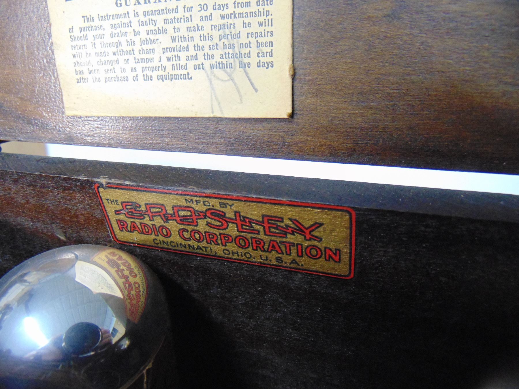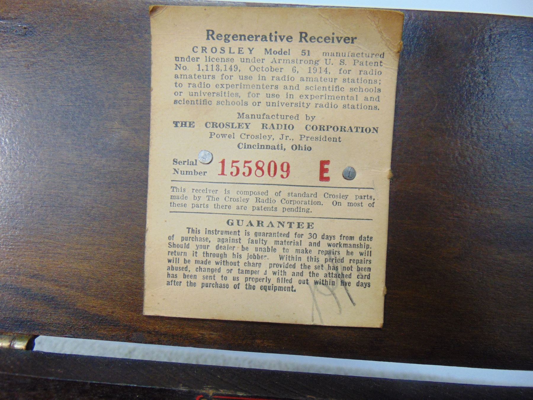 Crosley 2 tube regen receiver; model 51; includes tubes; early wood panel; original warranty card