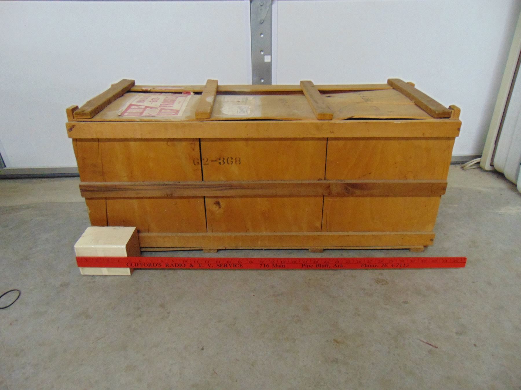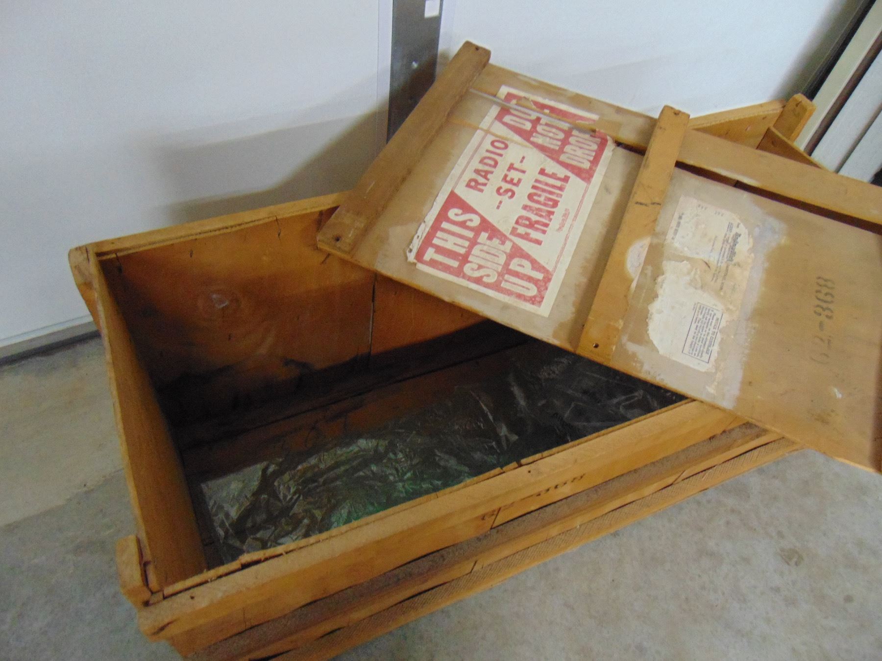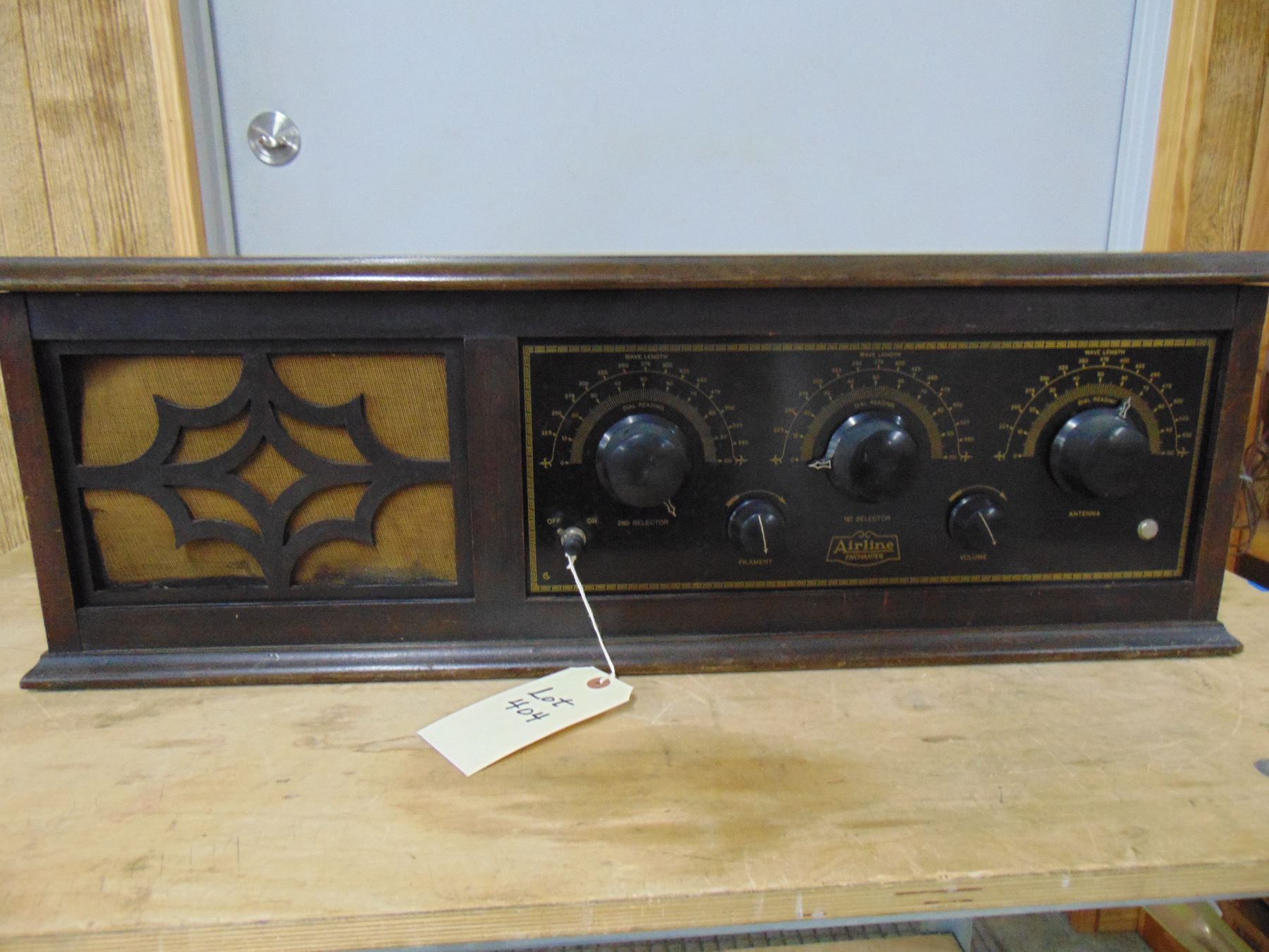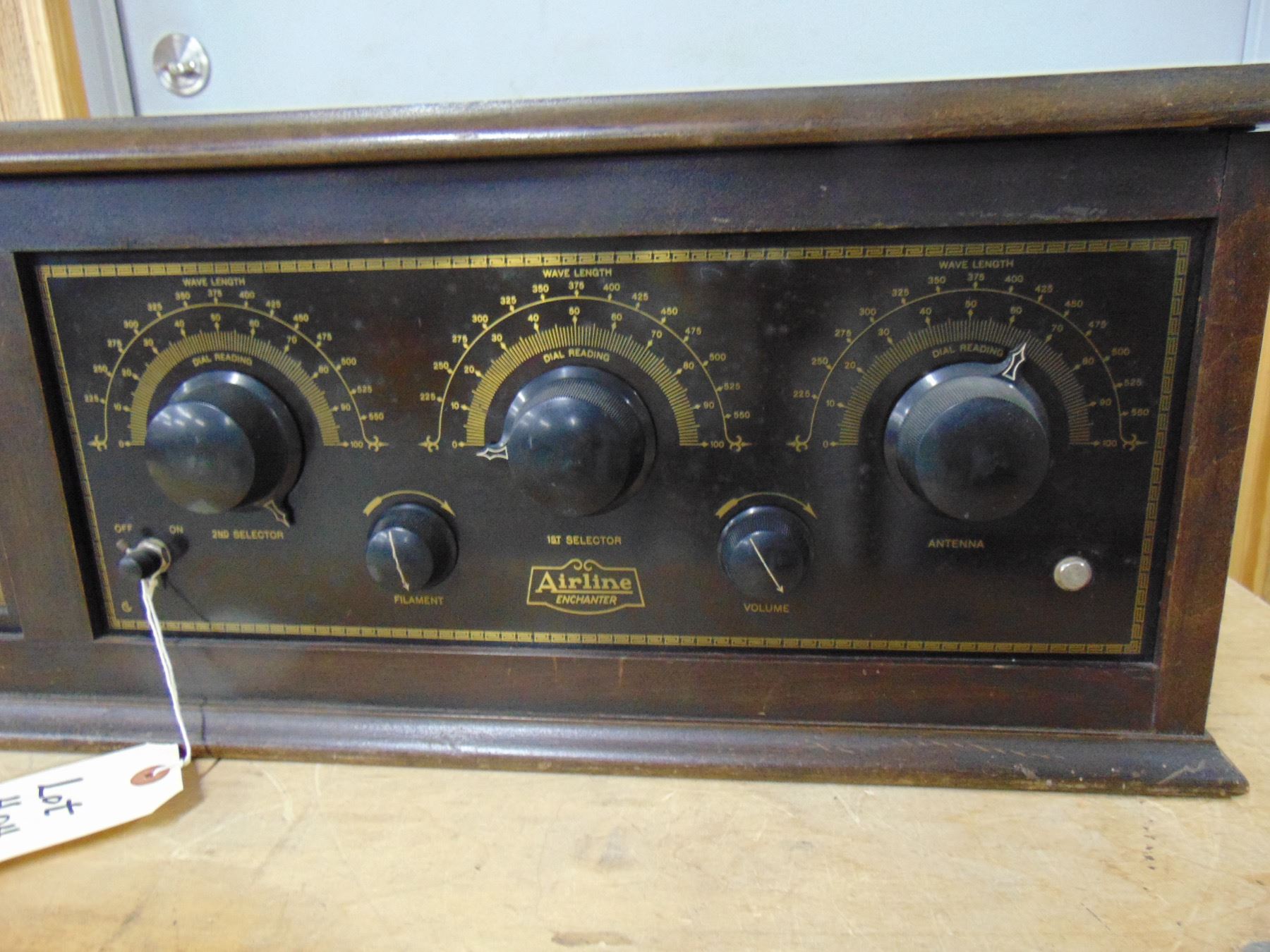 Airline 5 tube TRF "Enchanter" model with built-in horn speaker (good driver); metal front panel; no tubes; includes original wood Airline shipping crate, but not sure it is the correct crate for this radio.
