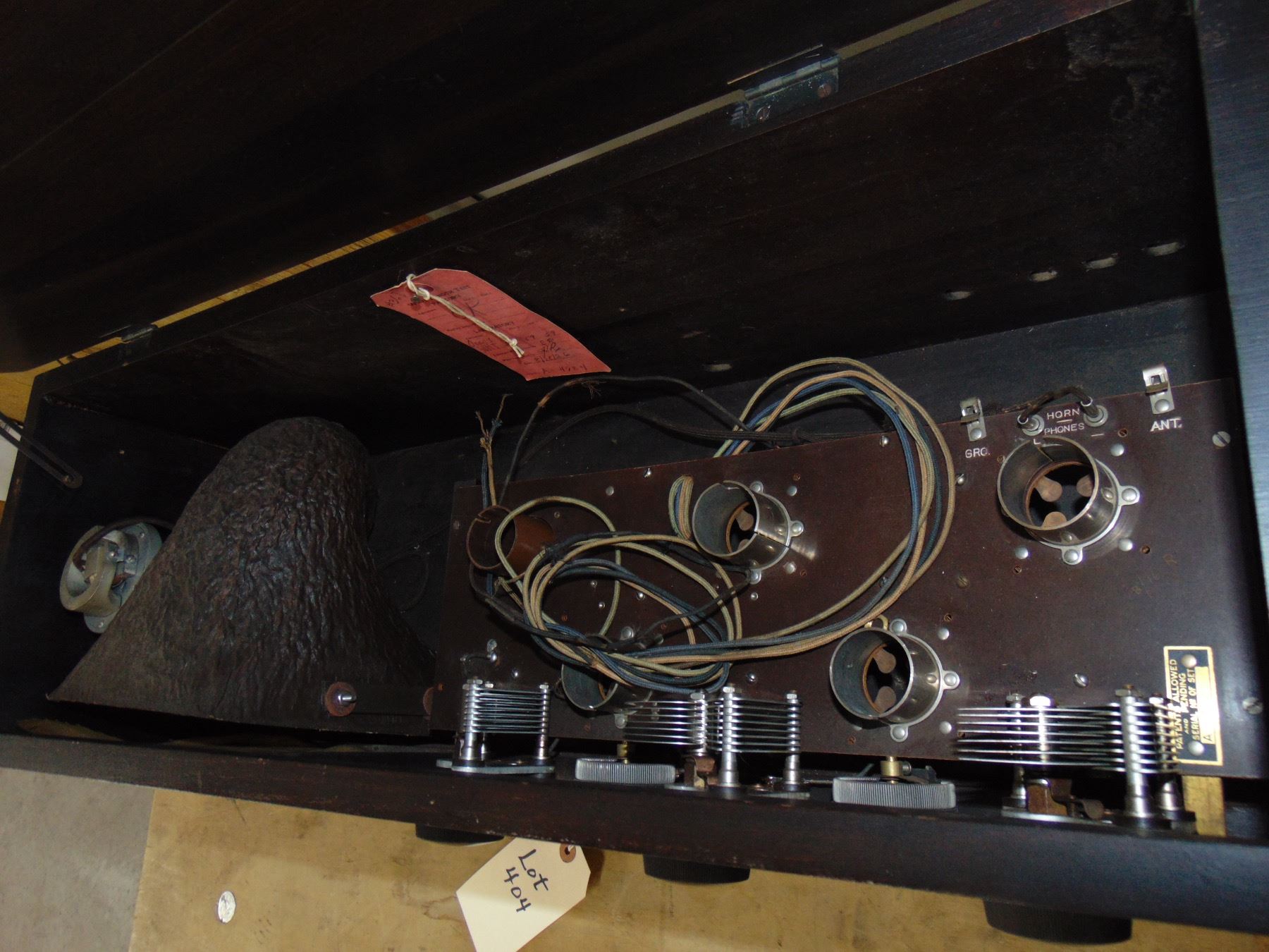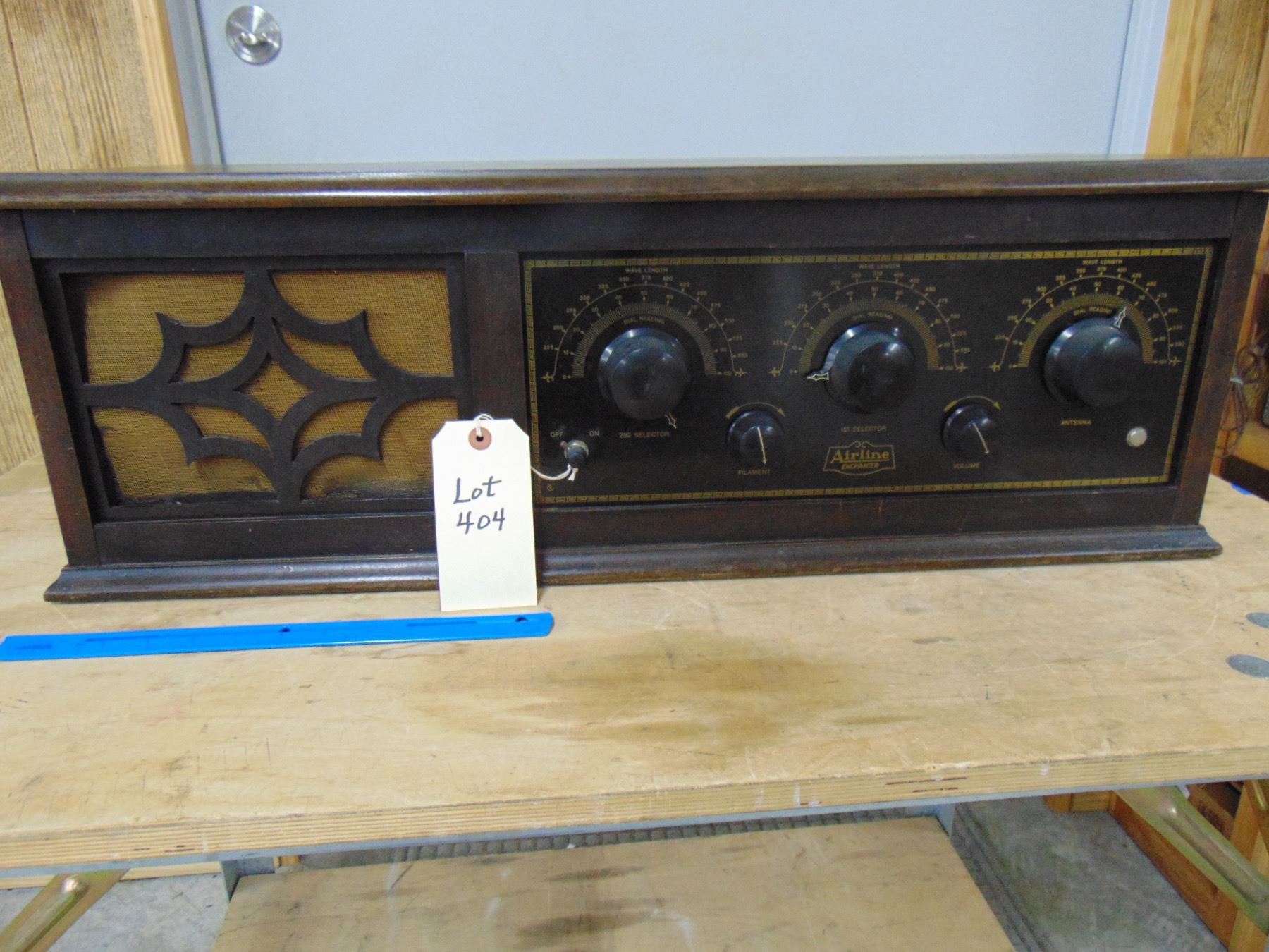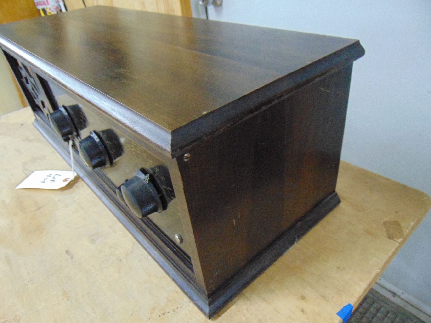 Airline 5 tube TRF "Enchanter" model with built-in horn speaker (good driver); metal front panel; no tubes; includes original wood Airline shipping crate, but not sure it is the correct crate for this radio.