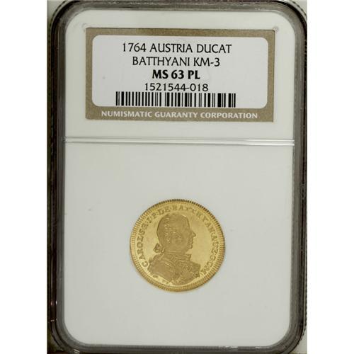 <B>Batthyani. Prince Carl gold Ducat 1764, </B></I>KM3, MS63 NGC Prooflike, a superb example with deep golden luster and fully reflective surfaces. The Batthyani's were a royal Hungarian family who acquired the coinage right in 1763.<BR><BR><b>Shipping:</b> Coin/Currency (<a target="_blank" href="http://www.heritageauctions.com/common/shipping.php">view shipping information</a>)