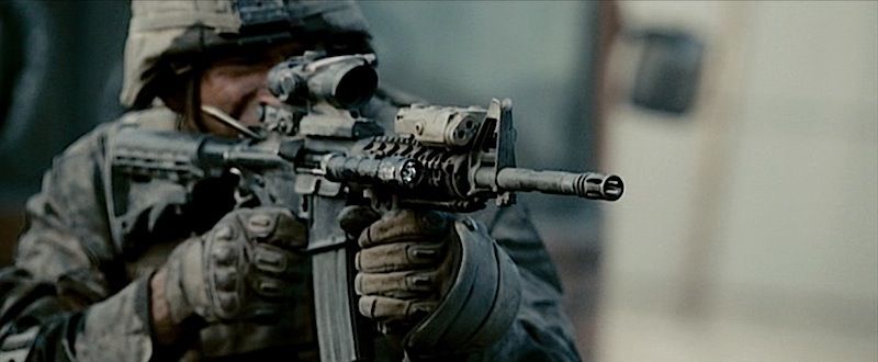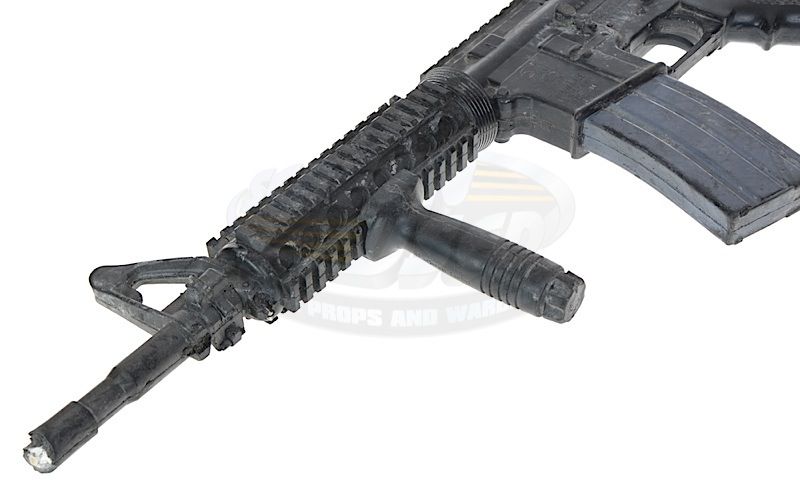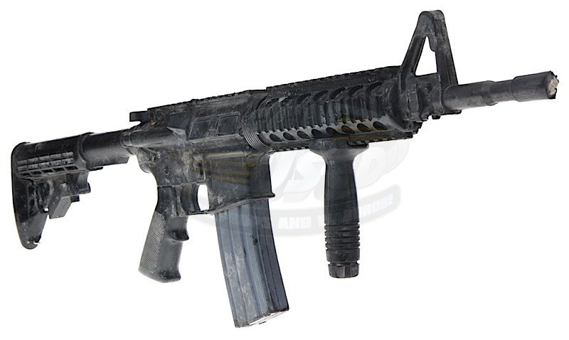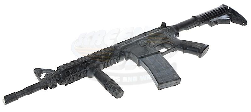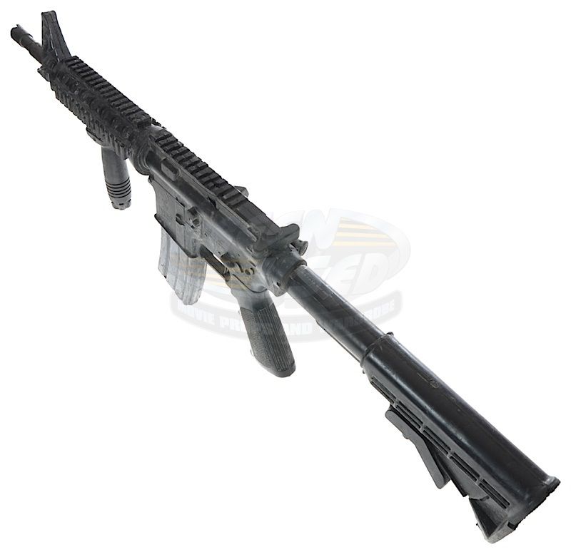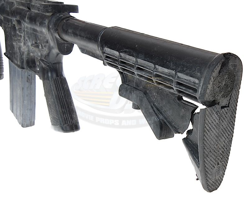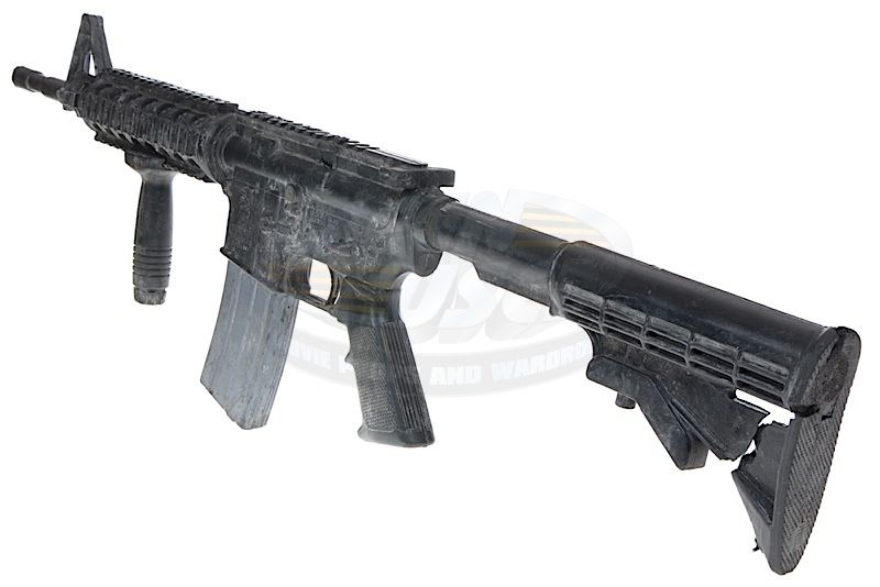 (Columbia Pictures, 2011) This prop M4 was custom-made by the production for use by Aaron Eckhart as "Sgt. Michael Nantz". The rifle is made of hard rubber and was used for stunt work during filming. The rifle has dust and wear present from heavy use on the set. All the rifles used on set by the principle actors featured a piece of clear tape attached on top behind the sight with the character's name printed on it. This was done to keep track of who used which weapons for continuity during filming.