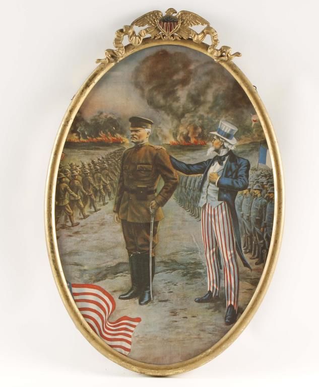 WWI, soldier with Uncle Sam. In cold colored oval frame with eagle above. Approx 14" wide x 22" high.