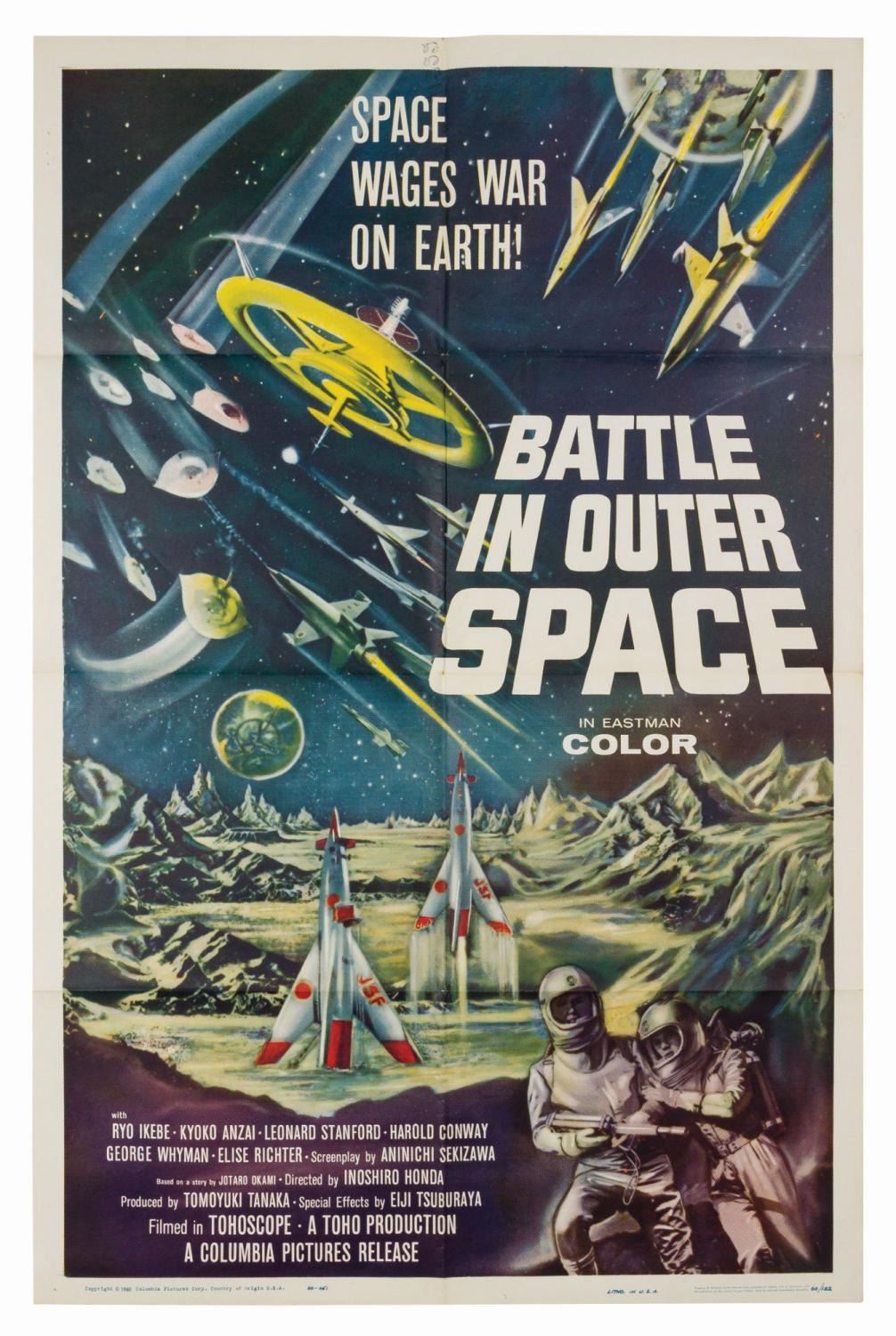 (Toho/Columbia, 1960) An original U.S. 1-sheet poster for Battle in Outer Space. Folded as issued, the poster measures 41"x27" and is in very good condition with a few pinholes, some discoloration, faint marginal creases, and felt pen notation on the reverse that is slightly visible from the front.
