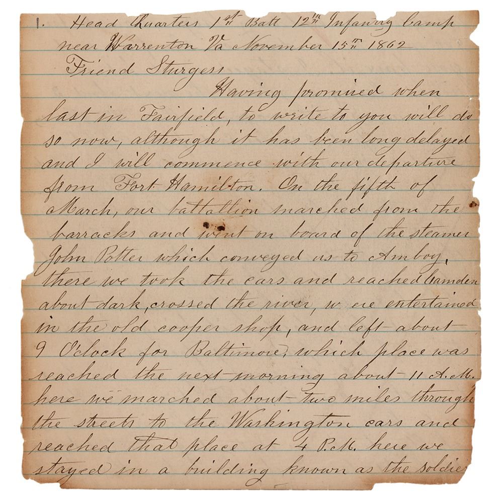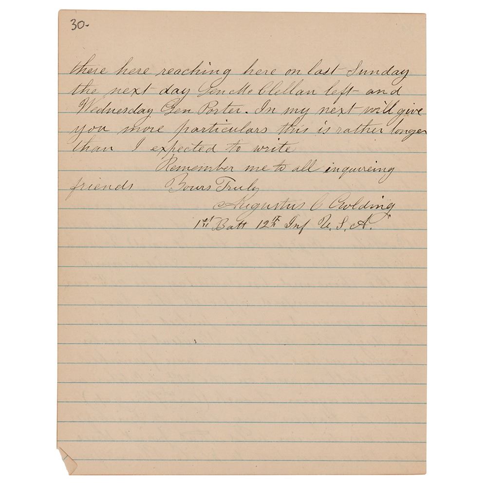 ALS signed "Augustus C. Golding," fifteen pages both sides, 6 x 7.75, November 15, 1862. Writing to his "Friend Sturgis," Sergeant Golding provides a detailed summary of the movements of the 12th United States Infantry from March through November 1862. It presents a well-written narrative of regimental activities through McClellan's Peninsula Campaign, Pope's Virginia Campaign, and the Battle of Antietam. The lengthy letter begins, in small part: "On the fifth of March, our battalion marched from the barracks and went on board of the steamer John Potter which conveyed us to Amboy, there we took the cars and reached Camden about dark." He spends a bit of time tracing their travels, before reporting on a rebel attack: "The rebels heated us with a few shells from a large gun one of them passed over our camp and struck near where I was washing a shirt but they done no damage and the gun soon exploded and stopped their fun."
