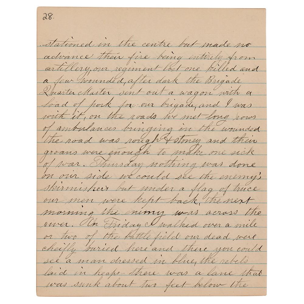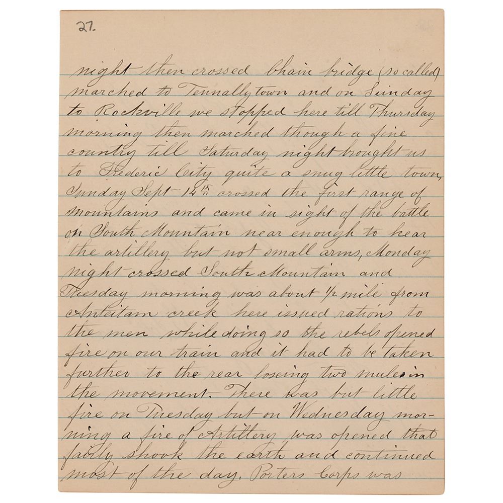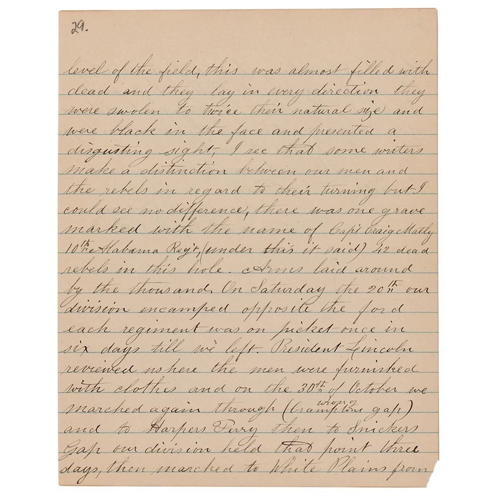 He goes on to mention marching to the White House, various skirmishes and battles with Confederate troops, and the capture of "the colors of a rebel regiment." On Sunday, September 14th, they "came in sight of the battle on South Mountain near enough to hear the artillery but not small arms," and crossed the mountain on Monday. Writing about Wednesday, September 17th—the Battle of Antietam—Sgt. Golding reports: "On Wednesday morning a fire of Artillery was opened that fairly shook the earth and continued most of the day. Porters Corps was stationed in the centre but made no advance their fire being entirely from artillery, our regiment lost one killed and a few wounded, after dark the Brigade Quarter Master sent out a wagon with a load of pork for our brigade, and I was with it, on the roads we met long rows of ambulances bringing in the wounded. The road was rough & stoney and their groans were enough to make one sick of war…On Friday I walked over a mile or two of the battle field our dead were chiefly buried here and there you could see a man dressed in blue, the rebels laid in heaps. There was a lane that was sunk about two feet below the level of the field, this was almost filled with dead and they lay in every direction they were swollen to twice their natural size and were black in the face and presented a disgusting sight. I see that some writers make a distinction between our men and the rebels in regard to their turning but I could see no difference, there was one grave marked with the name of Capt. Craig Motly, 10th Alabama Reg't (under this it said) 42 dead rebels in this hole. Arms laid around by the thousands. On Saturday the 20th our division encamped opposite the ford each regiment was on picket once in six days till we left. President Lincoln reviewed us here." In very good to fine condition.
