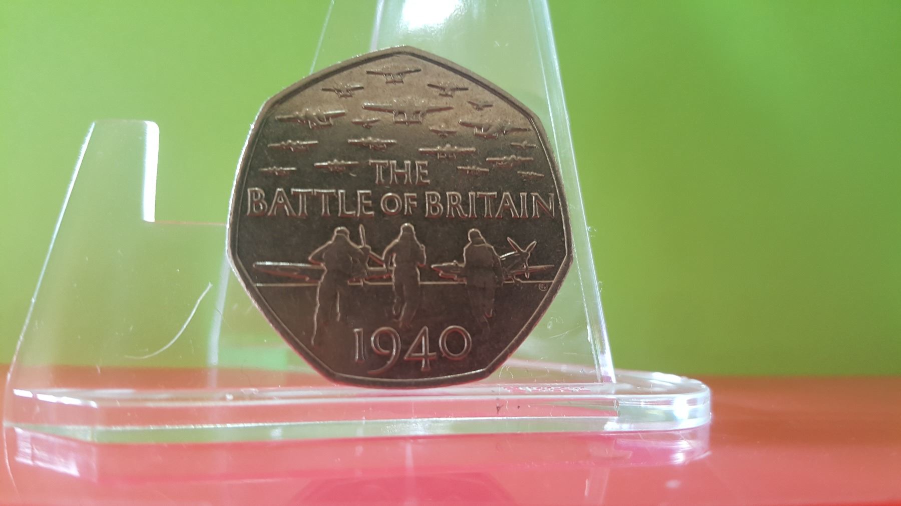 An official UK 50p remembers the Battle of Britain, honouring those who fought for control of the skies 75 years ago.depicts three fighter pilots scrambling for their Spitfires under a sky crowded with bomber