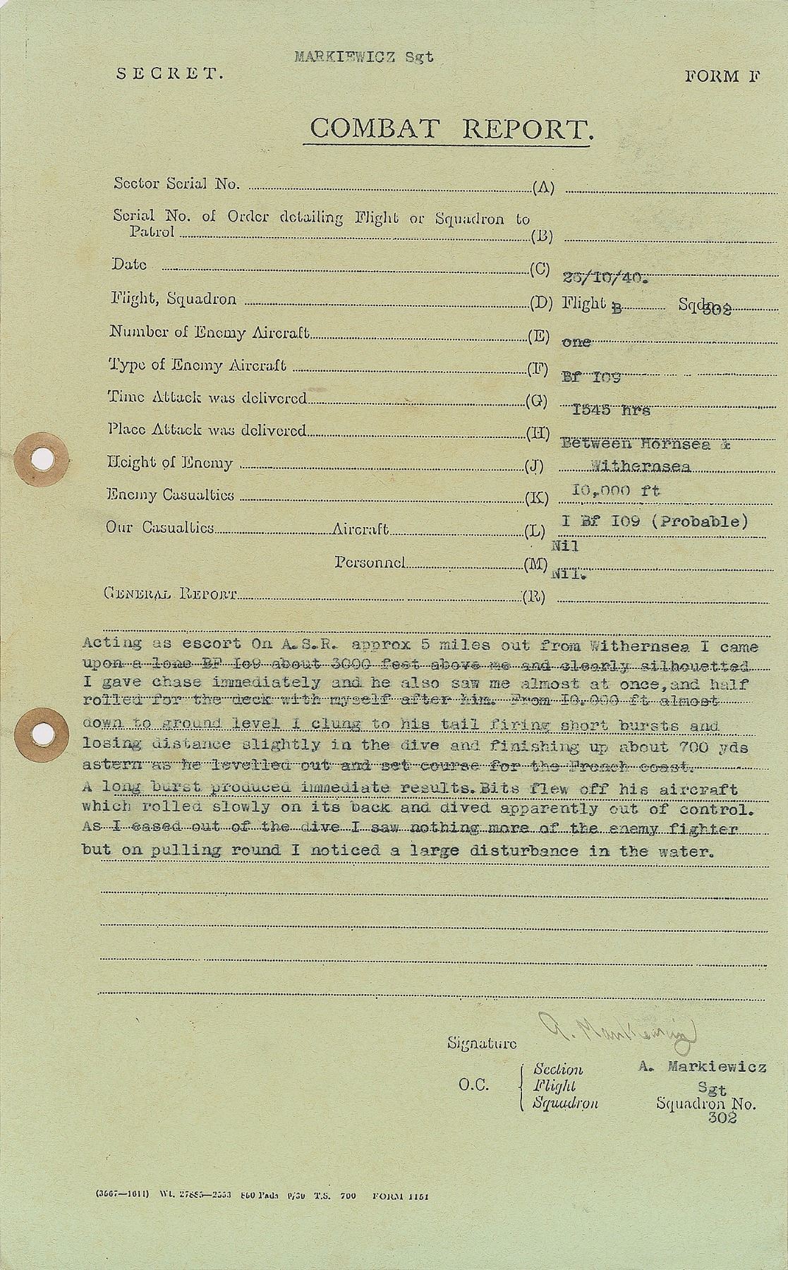 DS, signed “A. Markiewicz,” one page, 8 x 12.75, October 26, 1940. A "Combat Report" marked "Secret," describing an air fight during the Battle of Britain. In part: "Acting as escort on A.S.R. approx 5 miles out from Withernsea I came upon a lone BF 109 about 3000 feet above me and clearly silhouetted. I gave chase immediately and he also saw me almost at once, and half rolled for the deck with myself after him. From 10,000 ft almost down to ground level I clung to his tail firing short bursts and losing distance slightly in the dive and finishing up about 700 yds astern as he levelled out and set course for the French coast. A long burst produced immediate results. Bits flew off his aircraft which rolled slowly on its back and dived apparently out of control. As I eased out of the dive I saw nothing more of the enemy fighter but on pulling round I noticed a large disturbance in the water." In fine condition. Born on January 13, 1915, Markiewicz was a fighter pilot who joined the 302 Squadron at Leconfield on August 6, 1940.