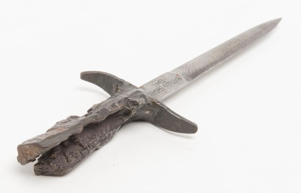 Battle of Britain letter opener made from German bomb shrapnel dropped on England during WW II; with letter from consignor describing how piece descended in family. Est.: $100-$300.