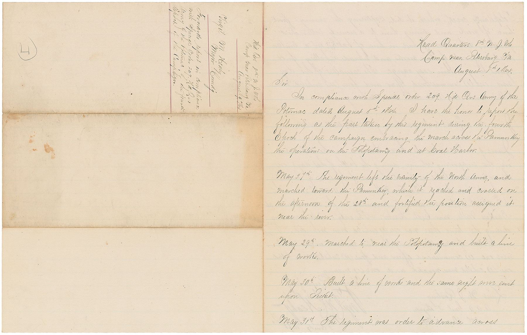 LS signed “Virgil M. Healy,” one page both sides, 7.75 x 9.75, August 8, 1864. Letter to W. J. Rusling, written from the "Head Quarters 8th N.J. I. Vols., Camp near Petersburg, Va.," containing a detailed record of the 8th New Jersey's movements during the Battle of Cold Harbor. In part: "In compliance with Special order 209 Hd Qrs Army of the Potomac…I have the honor to report the following…May 31st. The regiment was ordered to advance across Tolopotamay creek, which it did, capturing the enemy's first line of works, and driving him to a securely entrenched position, where he formed in line of battle, in a sunken road in front of their works, and silenced a battery of 4 guns, being within easy range. The casualties of this day were one (1) commissioned officer and four (4) enlisted men killed and one (1) enlisted man missing…June 2nd. Marched to Cold Harbor on the 3rd were in the supporting column, during the battle of that day; on the 4th were detailed as guard in rear of the line of battle; on the 5th marched to Barkers Mills and built works." In fine condition.