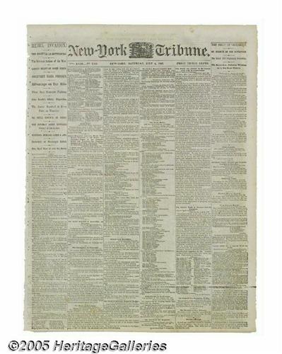 <B>Battle of Gettysburg Full Report, "New York Tribune," July 4, 1863</B></I> The Battle of Gettysburg was one of the major campaigns of the Civil War, fought 35 miles southwest of Harrisburg, Pennsylvania on the first three days of July in 1863. It resulted in a crushing defeat for the Confederacy and a huge loss of life on both sides. This issue of Horace Greeley's <I>New York Daily Tribune</B></I> is dated July 4, 1863 and has incredible front-page reporting of the battle. Also on the front page are accounts of what would turn out to be the final day of the Siege of Vicksburg, which ended on July 4th with a Confederate surrender. These two battles marked the turning point of the war for the Union. Eight pages, very fine condition, disbound but still attached at the spine, one small area of foxing on page six. An excellent resource for the Civil War historian. Lot:251