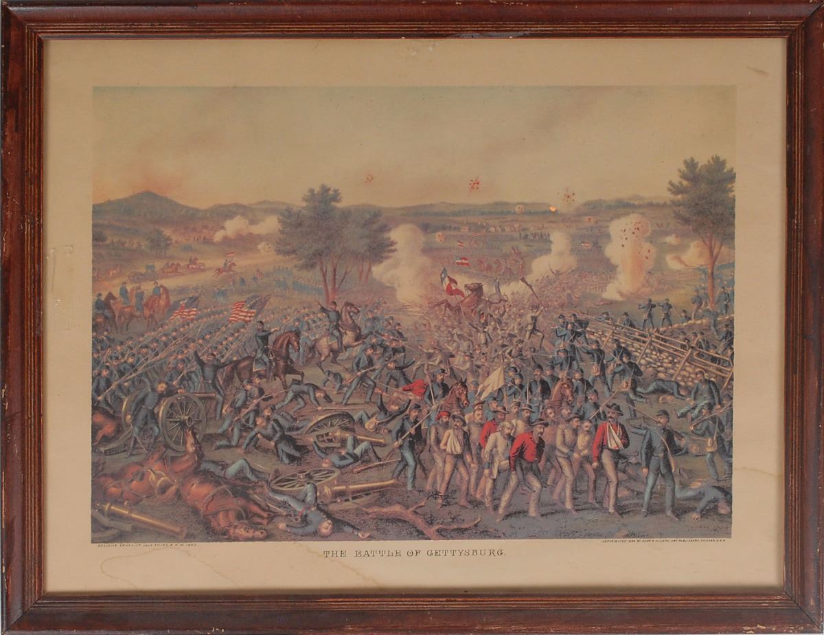 Color 23.5 x 17.5 chromolithograph print entitled “The Battle of Gettysburg,” captioned in the lower right, “Decisive Conflict, July Third, 4 P.M. 1863.” Text in the lower right reads, “Copyrighted 1884 by Kurz & Allison, Art Publishers, Chicago, U.S.A.” Framed to an overall size of 26 x 20. In very good condition, with large areas of dampstaining to lower border.