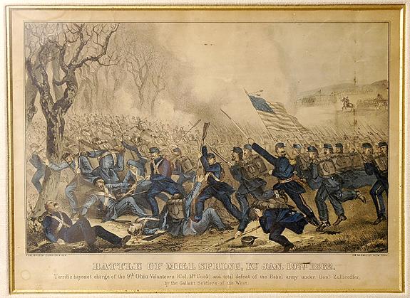 Battle of Mill Spring, KY Jan. 19th 1862. Hand-colored lithograph by Currier & Ives, 9½ x 13¼" (image is 8 x 12½") 152 Nassau St. New York is at lower right below image. Matted and framed to an overall size of 15¼ x 19". Depicting the bayonet charge of the 9th Ohio Volunteers under Co. McCook against Confederates forces under Gen. Zollicoffer. Very good; toning and a few minor creases in upper background.