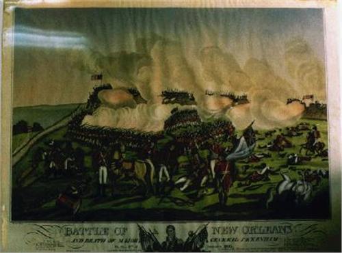 Battle of New Orleans. The most important American victory of the War of 1812, taking place on Jan. 8, 1815, in which Andrew Jackson defeated the British. Large hand-colored engraving depicting the battle, by Joseph Yeager, who has signed in plate. Designed by West, printed by Daurman, published by McCarty & Davis, Philadelphia, 1817. 15 x 19 -1/4 (including 2" lower margin, containing title and details of the print). Beautiful rich and crisp color, with no evidence of fading. "General Pakenham," the British general, shown lying on ground, surrounded by Redcoats, with several columns of British soldiers marching behind him, British flag unfurled. In the distance, a very long column of American troops shown descending from a hill, U.S. flags flying at head and rear of line. The British lost 700 in this battle, the Americans only eight. Light edge toning at margin, restoration of small upper right corner, and at extreme lower left a small tear has been expertly repaired. Very faint rippling of paper. Floated and shrink wrapped on white board, easily removed if desired. A strong rendering of this notable event in American history. A significant military print.