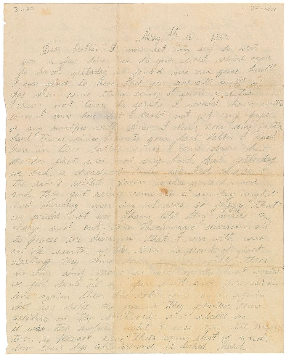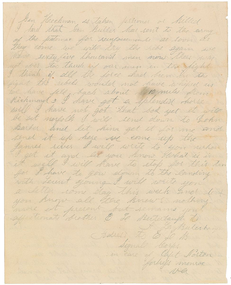 Civil War–dated ALS signed “E. L. Buterbaugh,” one page both sides, 8 x 10, May 17, 1864. Letter home to his brother containing gruesome content on the Battle of Proctor's Creek. In part: “I have been in three battles since I come down here. The first was not very hard but yesterday we had a dreadful time. We had drove the rebels within seven miles of Richmond and they got reinforcements. Sunday night and Monday morning it was so foggy that we could not see them till they made a charge and cut Gen. Heckman's division all to pieces…They come down on us with three divisions and drove us out of the breast works. We fell back to an open field and formed in line again then the rebs come on us again but we held the ground, they planted some artillery on the breastworks and shelled us. It was the awfulest sight I ever saw. See men torn to pieces some their arms shot off and some their legs all around it looked hard. Gen. Heckman is taken prisoner or killed. I heard that Gen. Butler has sent to the Army of the Potomac for reinforcements as soon as they come we will try the rebs again.” In very good condition, with intersecting folds and scattered staining. Accompanied by the original mailing envelope.