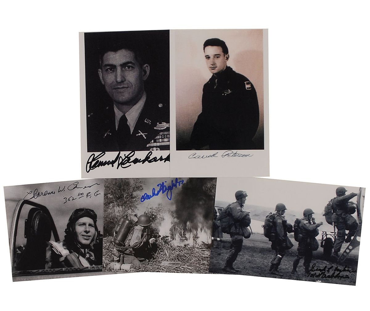 Five glossy photos, 6 x 4 and 4 x 6, each signed in felt tip or ballpoint by a Battle of the Bulge participant. Signers are: Grady Boykin, Carroll Peterson, Charles ‘Neighbor’ Cook DeWitt, Samuel Lombardo, and Clarence ‘Spike’ Cameron. In overall fine condition.